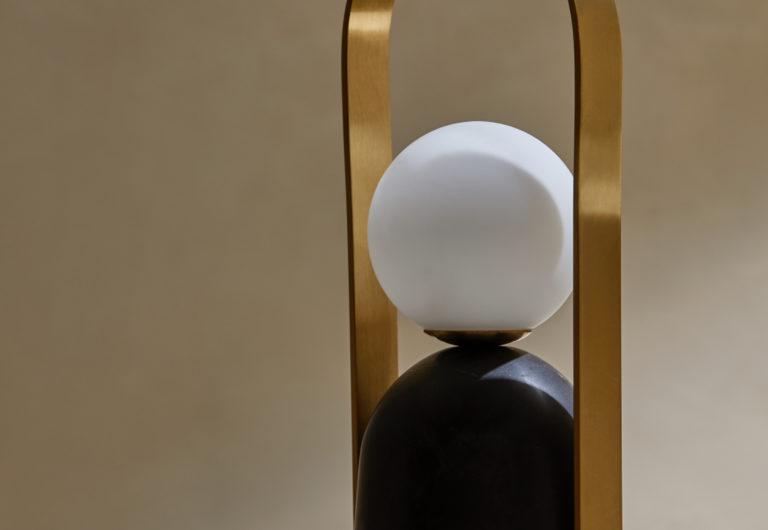 Настольная лампа, выполненная из стали и мрамора в матовой черной и латунной отделке с плафоном из опалового стекла. Беспроводное зарядное устройство в комплекте.