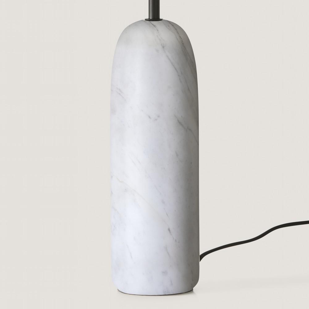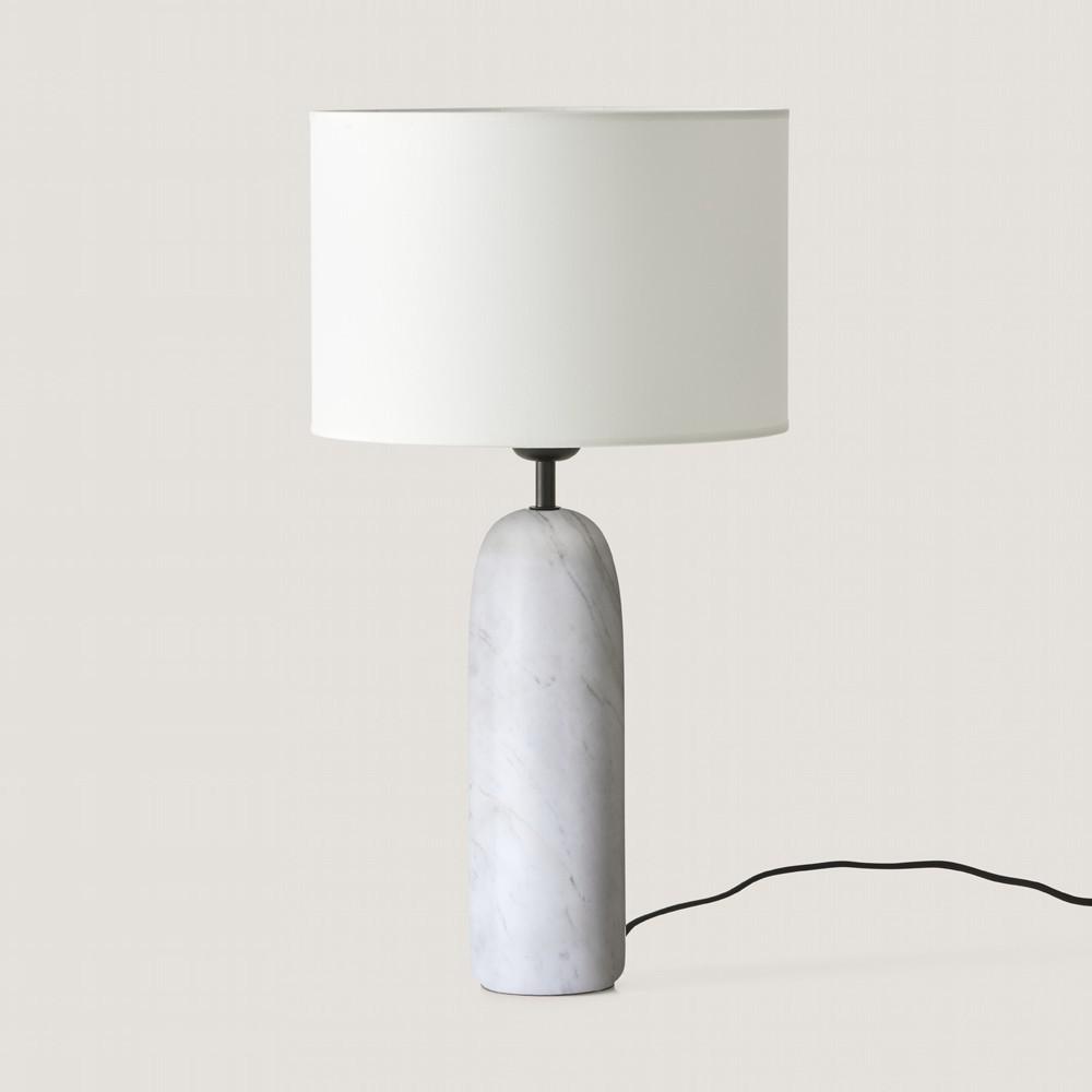 Настольная лампа с мраморным основанием черного или белого цвета и тканевый абажур.