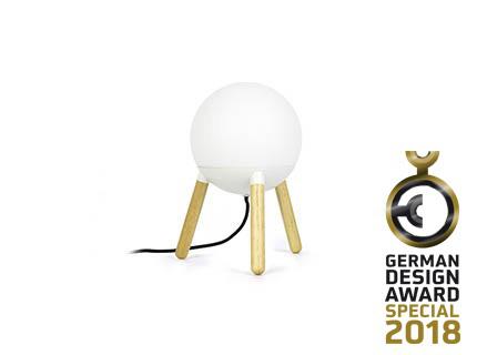 Белая настольная лампа с древесной структурой и рассеивателем из поликарбоната от Nahtrang. Материал и свет дают теплое и удобное прикосновение.