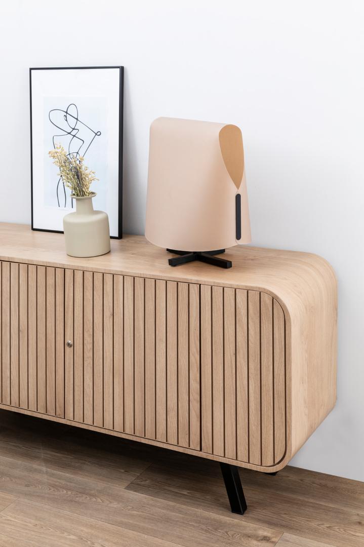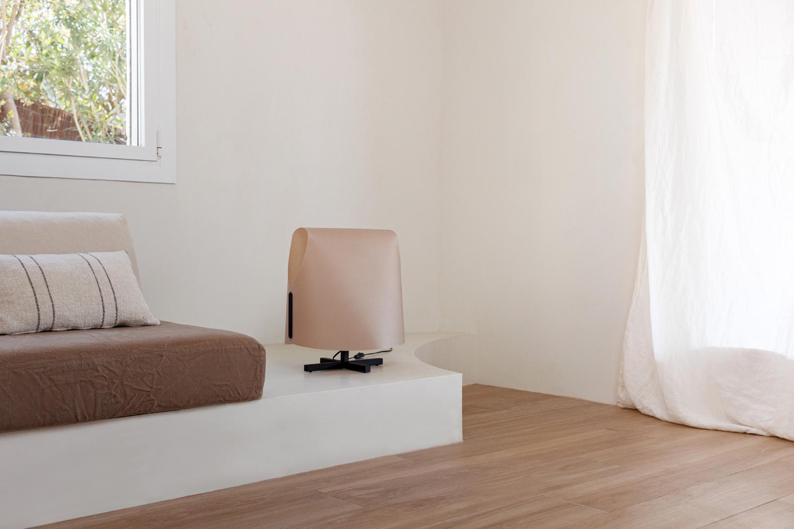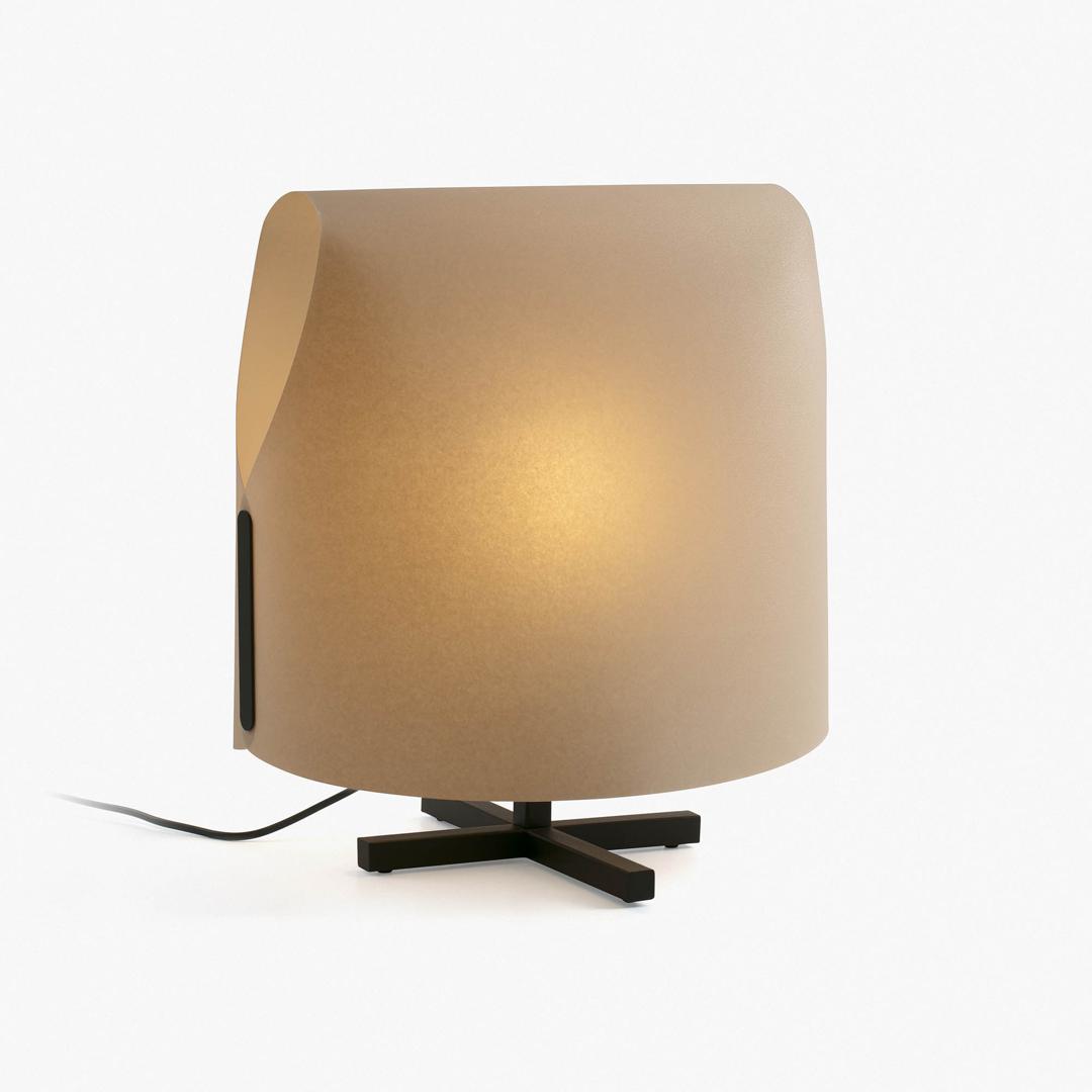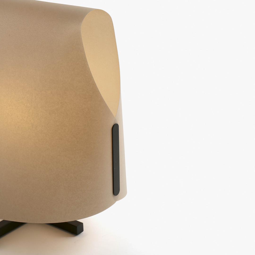 LUANG M — настольная лампа местного производства, разработанная Faro Lab. Семья Луанг вдохновляется искусством и предметами ручной работы, сделанными из папируса и натуральных волокон в Юго-Восточной Азии, а также тем, как они создают невероятно формальные поэтические и сложные объемные объекты из плоских элементов. Он имеет минималистскую структуру, которая резко контрастирует со свободным и органичным внешним видом его тени, которая, не имея структуры и материализуясь исключительно в папирусе, полностью светится. Оттенок этой модели — верблюжий, обеспечивающий очень естественный уютный свет.
