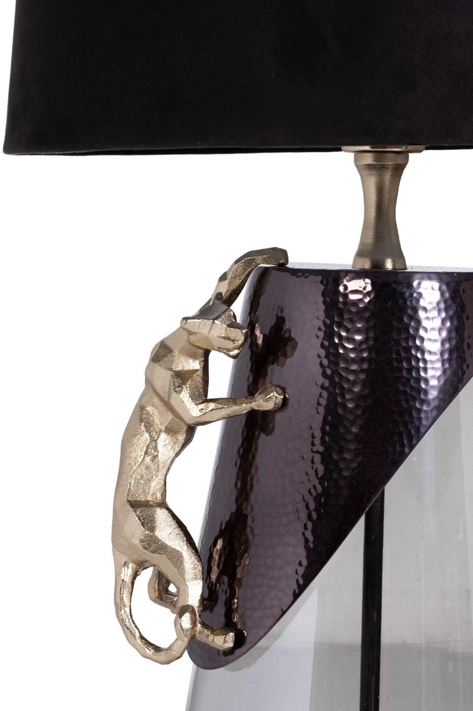 description-full - Стильная настольная лампа с черным абажуром будет уместно смотреться как в светлых, так и в темных интерьерах. Она обладает особым шармом, присущим только эксклюзивным вещам. Фишка данной модели – позолоченная фигурка ягуара, которая украсила опору светильника. За счет этого настольная лампа из стекла приобрела выраженную декоративность и стала той самой вещью, которая приковывает к себе внимание. Плафон выполнен из высокопрочной ткани с полиэфирными волокнами – не выгорает, не деформируется, долго служит. Купить декоративную настольную лампу можно для гостиной, спальни, холла, она украсит собой интерьер в стиле арт-деко, неоклассика, арт-нуво, шебби-шик.