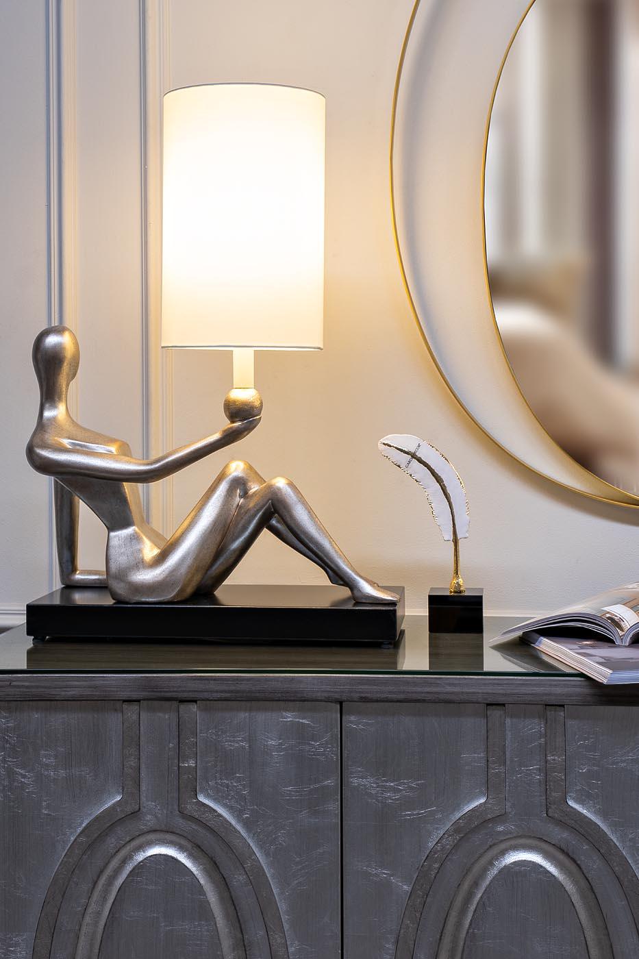 description-full - Дизайнерская настольная лампа является настоящим произведением искусства. Изящная стилизованная женская фигура серебристого цвета держит в руке бежевый плафон классической формы. Фигура женщины, приподнявшейся на локте в позе мадам Рекамье - знаменитой светской красавицы эпохи Директории во Франции XIX века, придаст особое очарование спальне, будуару или элегантному кабинету. Скульптурная композиция выполнена из дерева и полирезины; все детали окрашены и залакированы вручную по авторской технологии. Настольная лампа создаст изысканный дуэт с дизайнерской лампой арт. ART-4492-LM, изображающей стоящую фигуру с плафоном в вытянутой вверх руке.