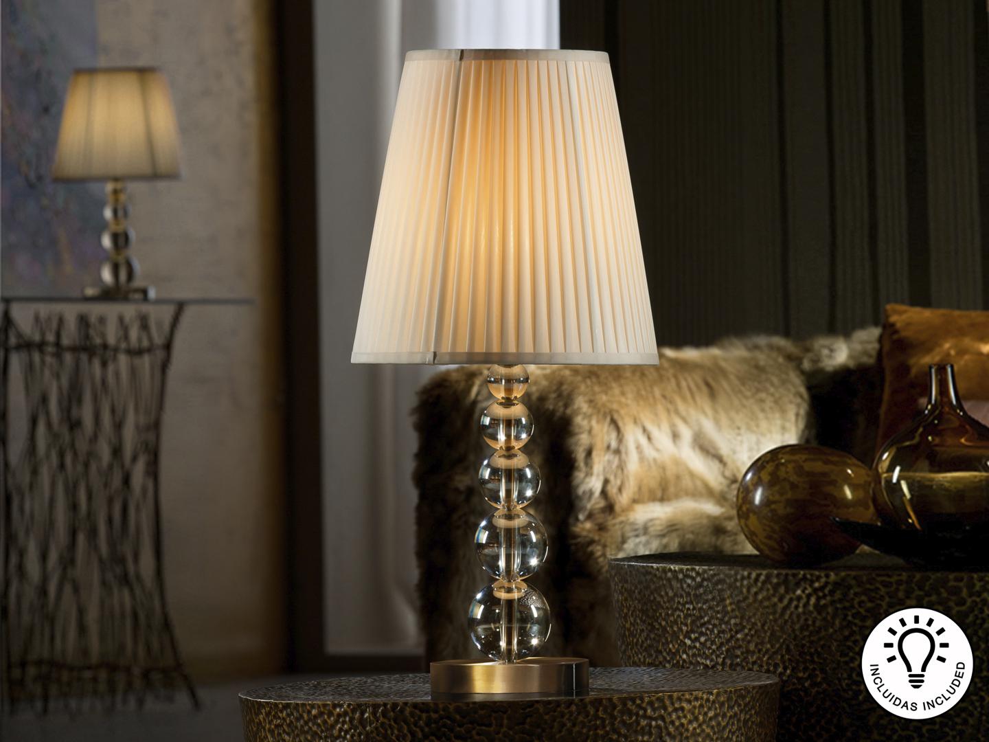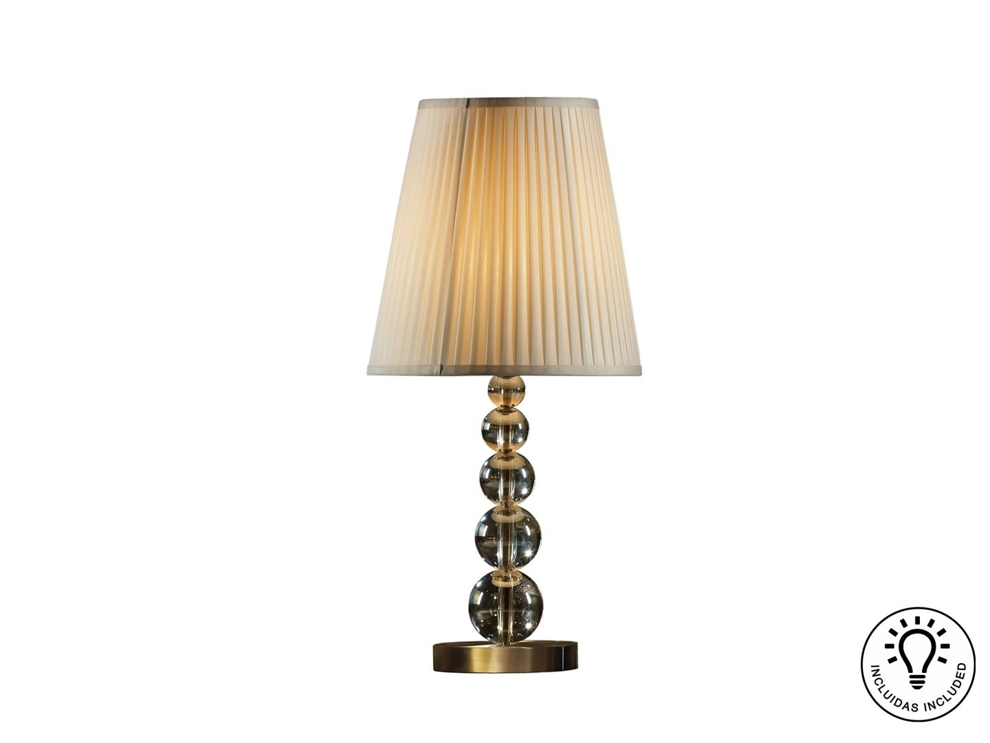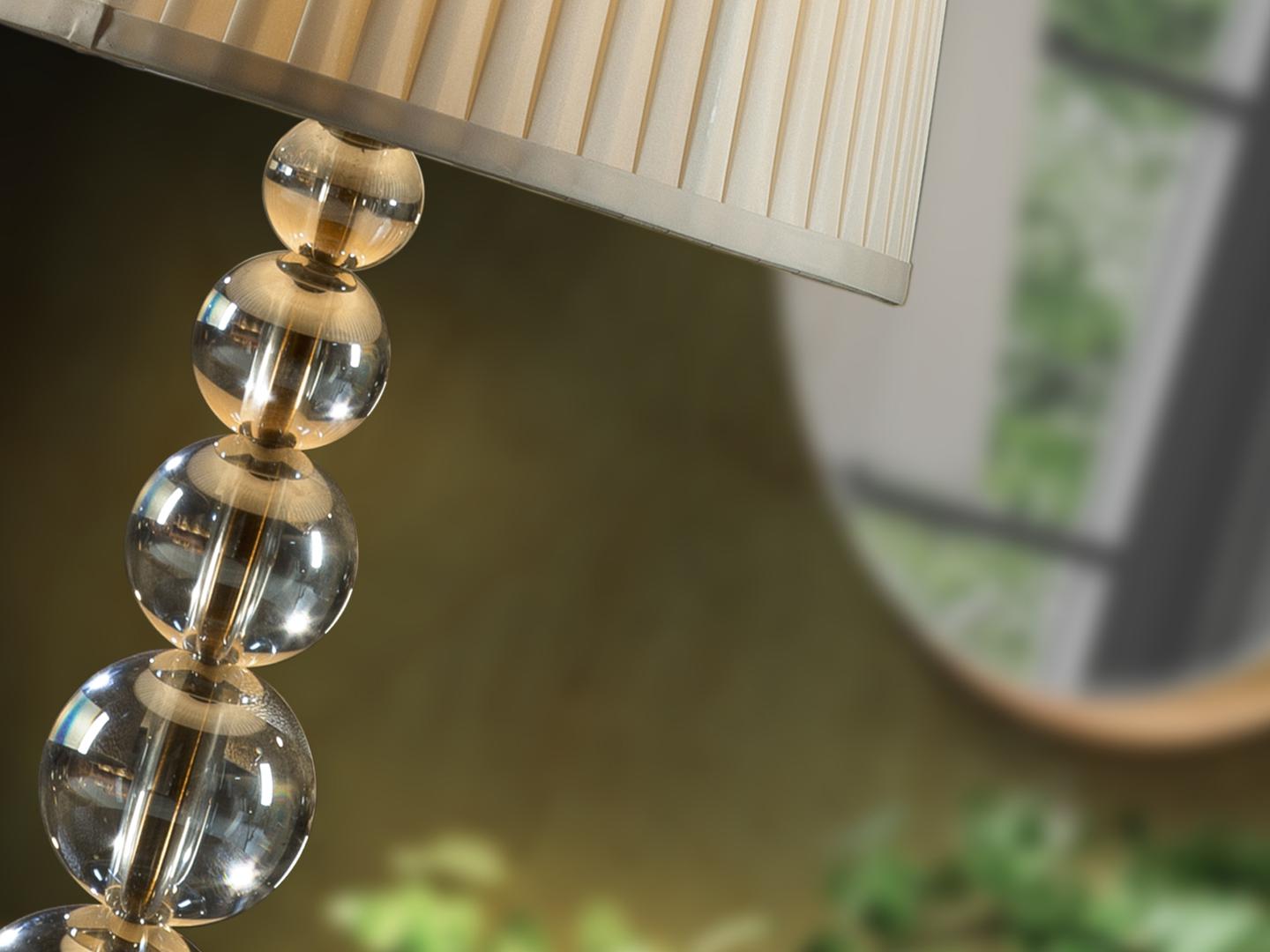 Большая настольная лампа на 1 лампочку, изготовлена из стекла цвета шампанского. Металлические части и основание в старинной медной отделке. Абажур бежевого оттенка. Включает 1 светодиод E27 10 Вт.