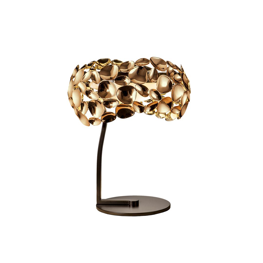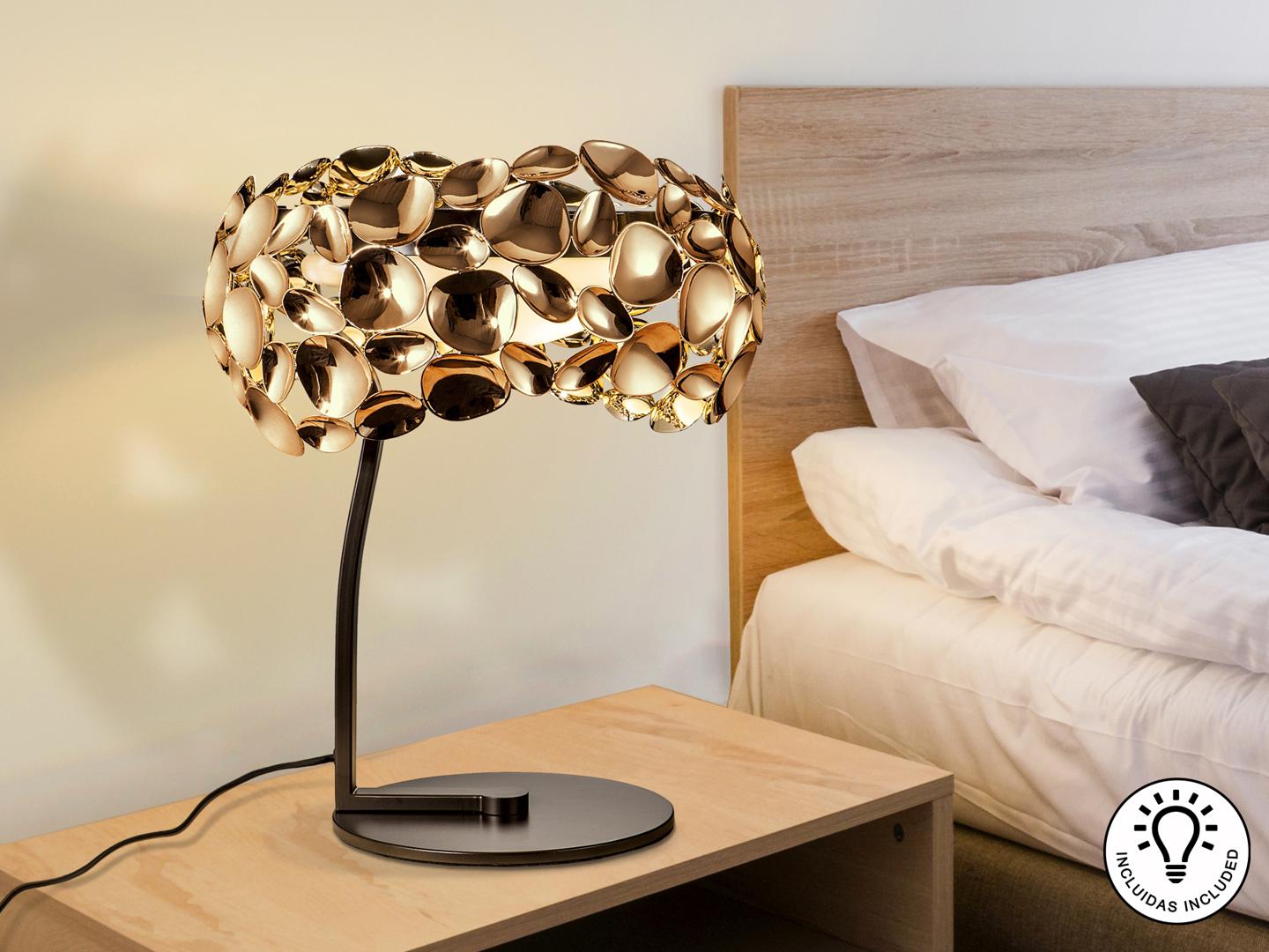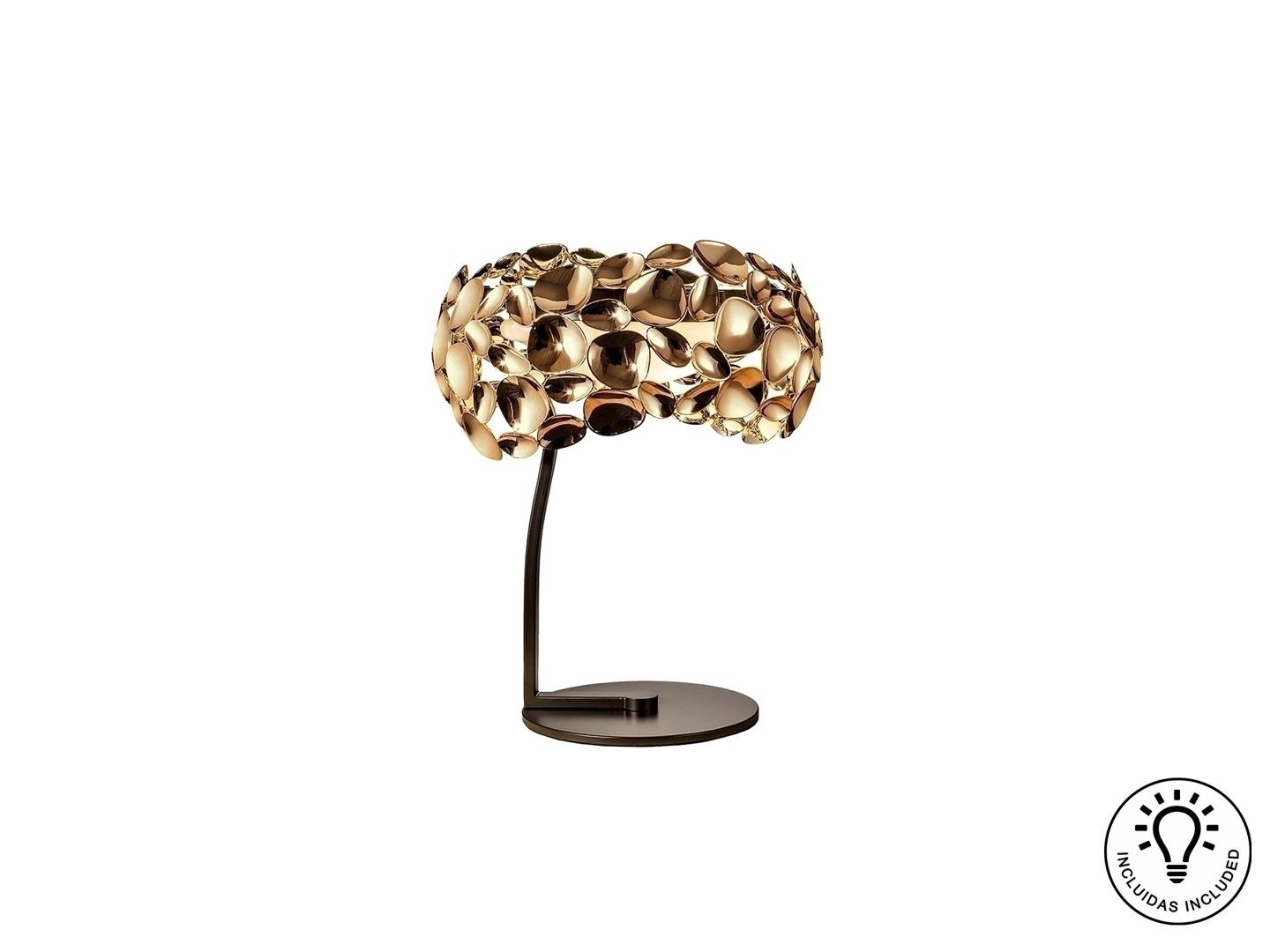 Настольная лампа с 3 лампами, из металла с покрытием "розовое золото" и с тёмно-коричневым покрытием, акриловый рассеиватель внутри. Включает 3 светодиода G9 мощностью 6 Вт.