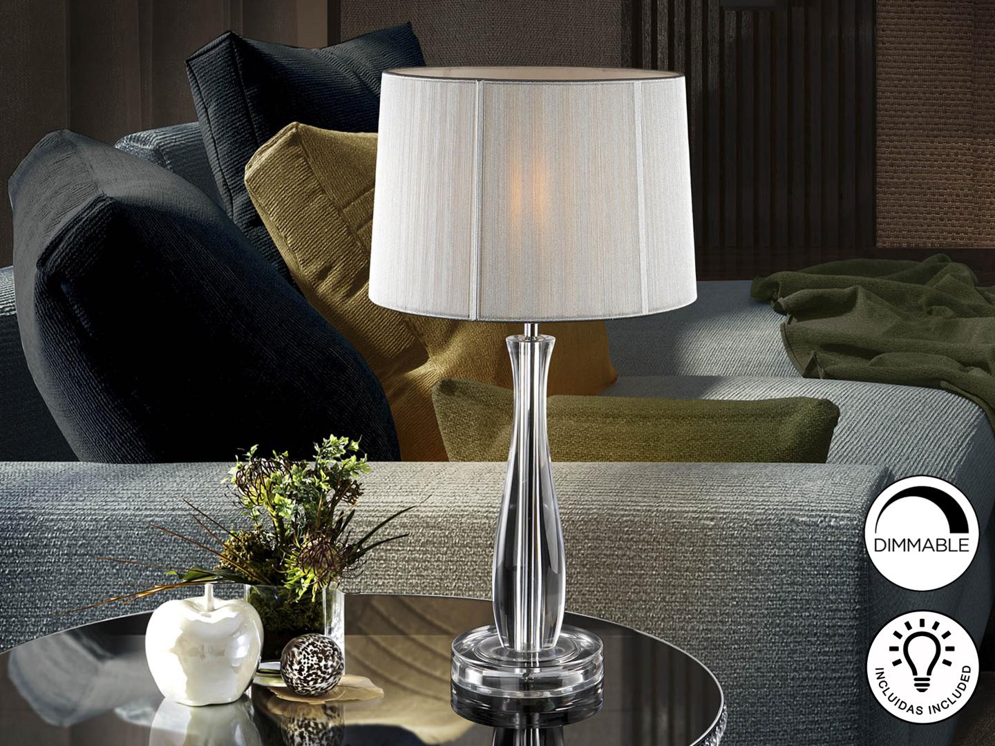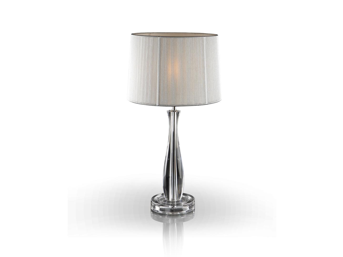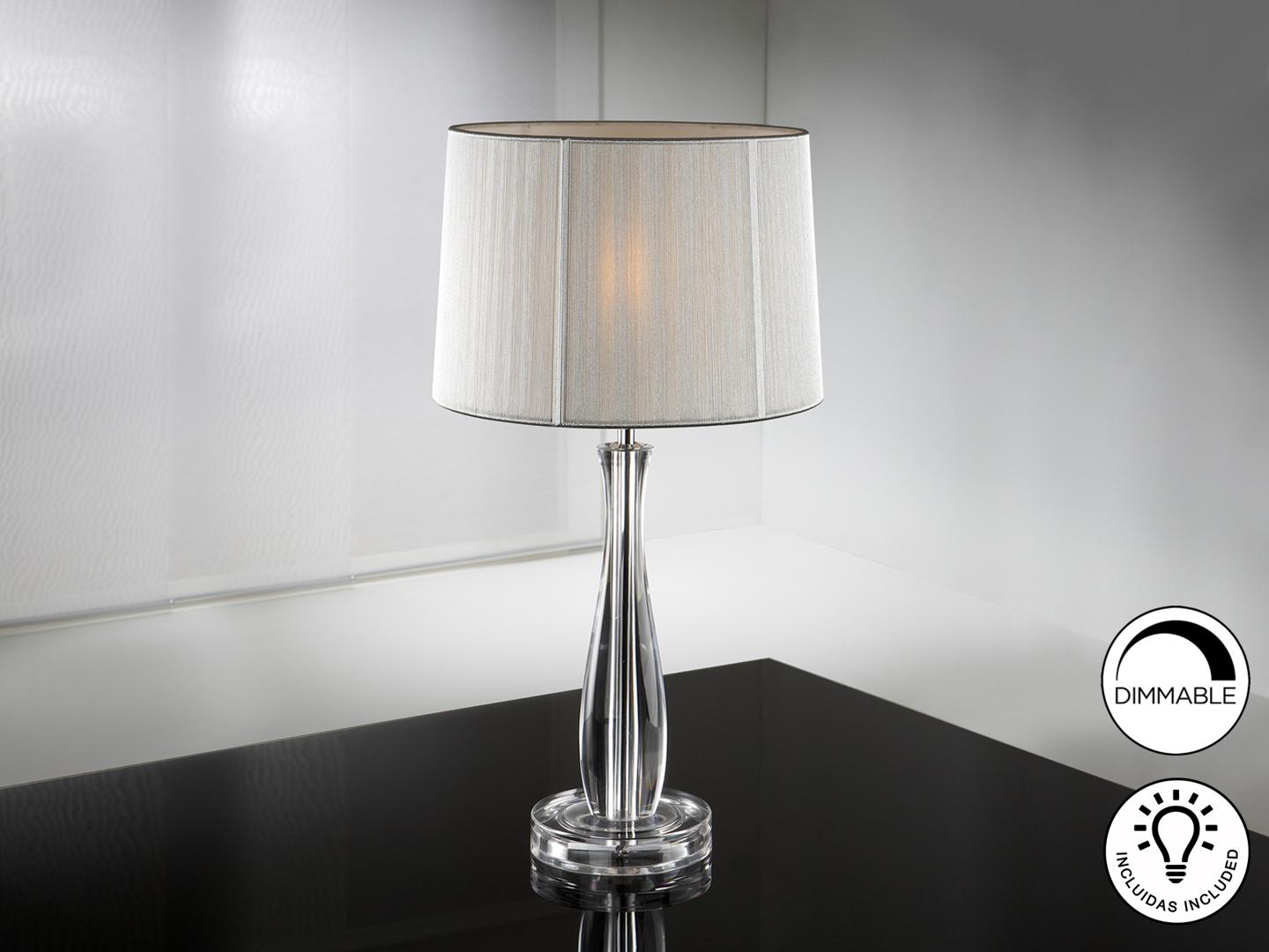 Настольная лампа из метакрилата, с 1 лампой, абажур из серебристо-белой тесьмы. Включает 1 светодиод E27 7 Вт. Диммируеый.