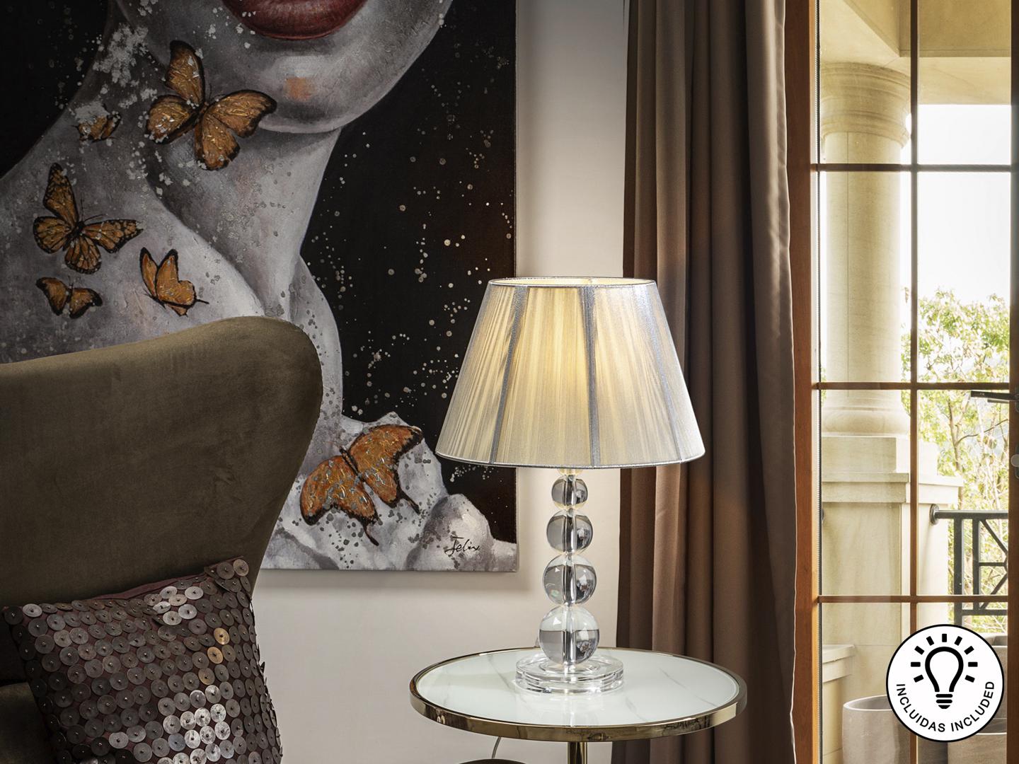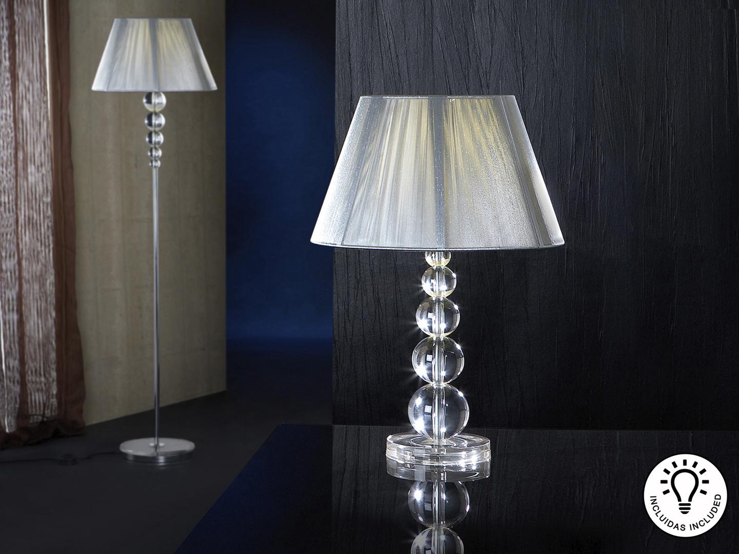 Настольная лампа из прозрачного метакрилата, с 1 лампой, абажур из шёлковой серебристой тесьмы с подкладкой, Включает 1 светодиод E27 10 Вт.