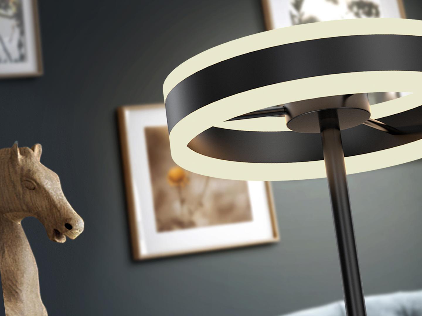 Настольная лампа из металла и алюминия, матовая черная отделка. Кольцо с рассеивателем из опалового акрила. Светодиод 36Вт. 3000 тыс. 3.100 лм