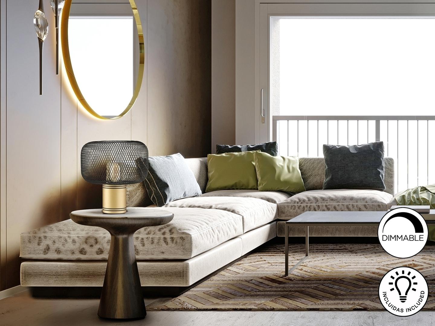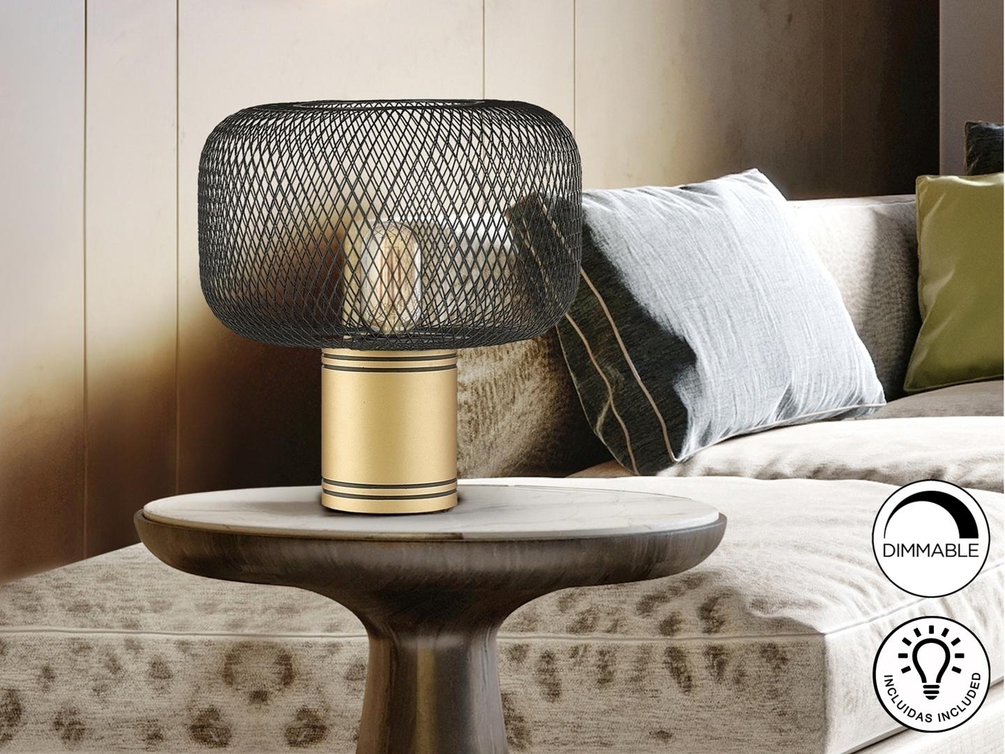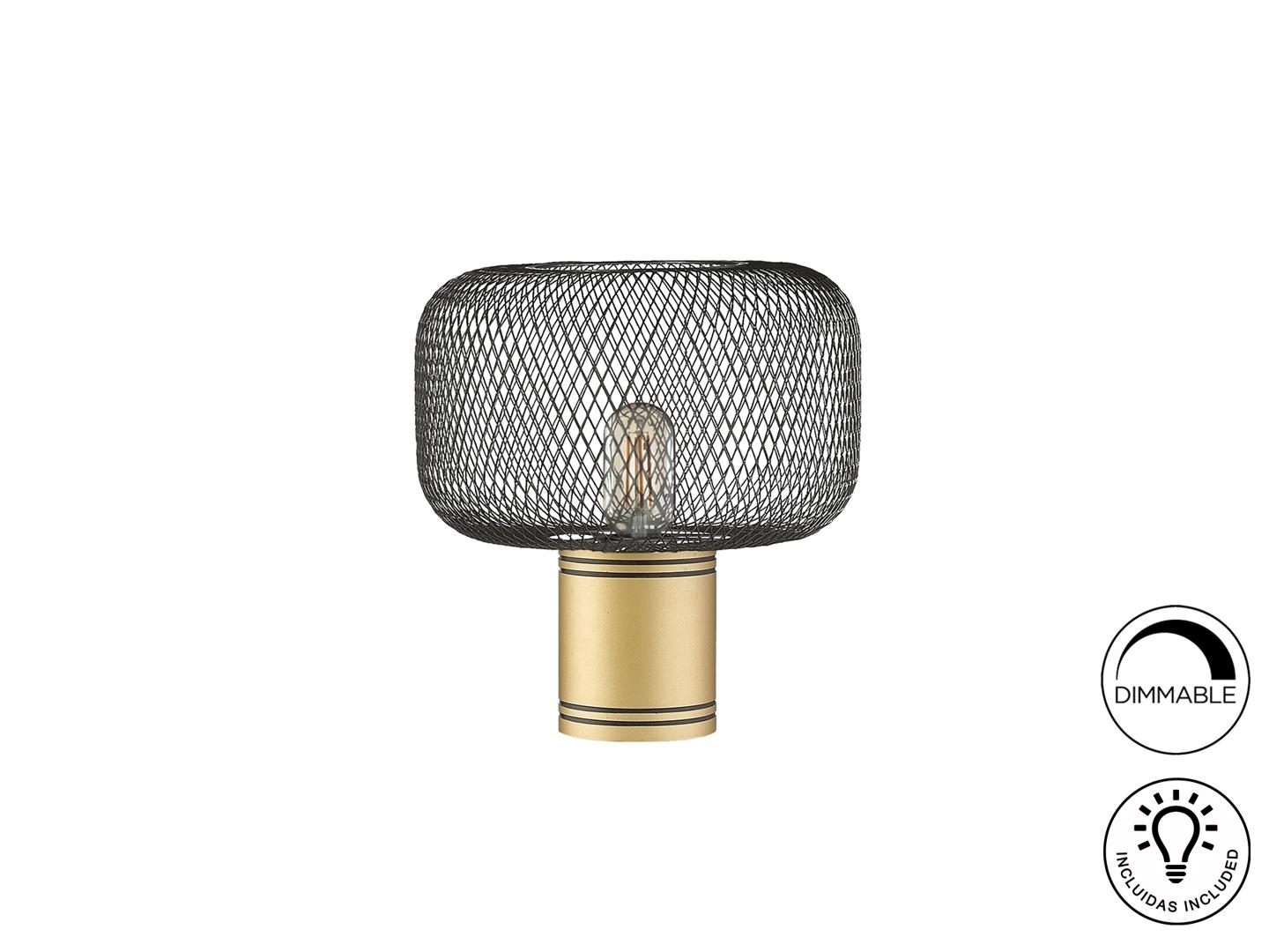 Настольная лампа на 1 лампочку из металла, окрашенного в золотистый цвет. Абажур из металлической сетки черного матового цвета. ·Этот товар включает в себя 1 светодиод E27 8 Вт.. DIMABLE.