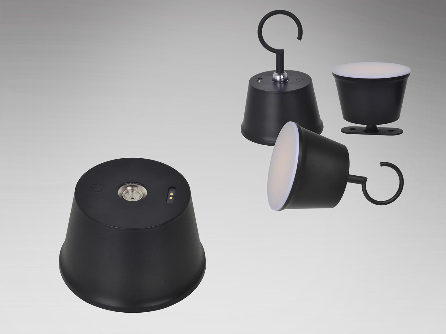 Светодиодная настольная лампа для использования в помещении и на улице, в комплект входят магнитные аксессуары для использования в качестве настенного или подвесного светильника. Изготовлена из металла с черным покрытием и рассеивателем из опалового акрила. Аккумуляторная батарея. Светодиод 3 Вт, 200 лм, 3000 К. С РЕГУЛИРОВКОЙ ЯРКОСТИ. IP54. Литиевый аккумулятор, 3000 мАч. Время зарядки 5 часов, приблизительное время автономной работы 6 часов. Зарядное устройство в комплекте
