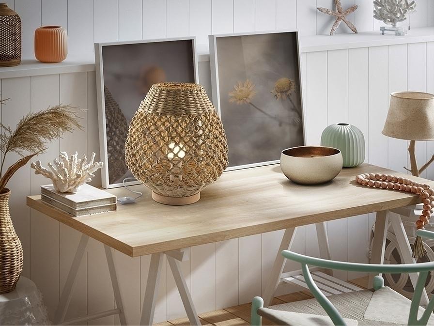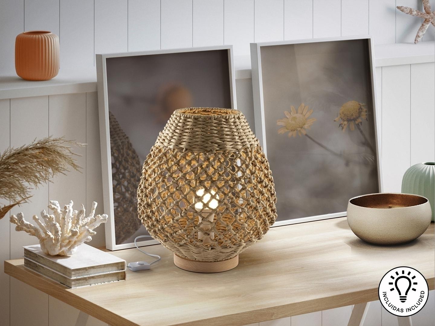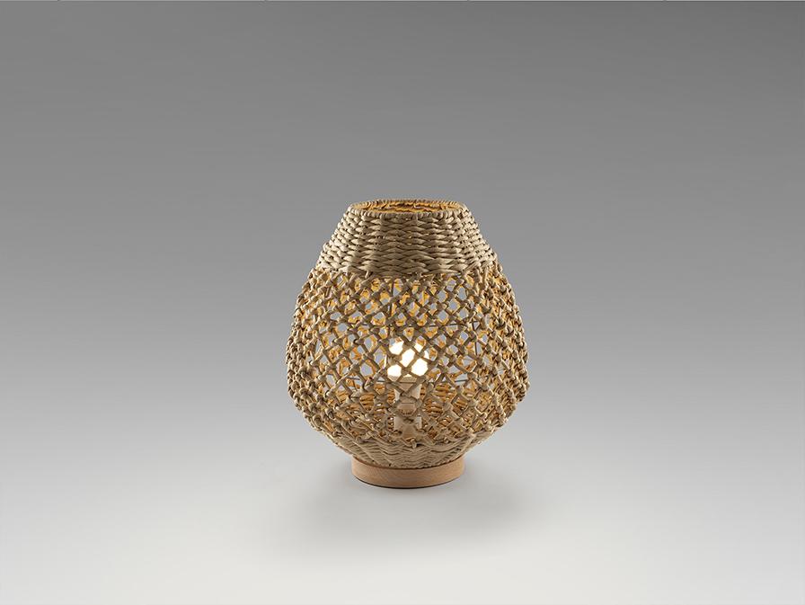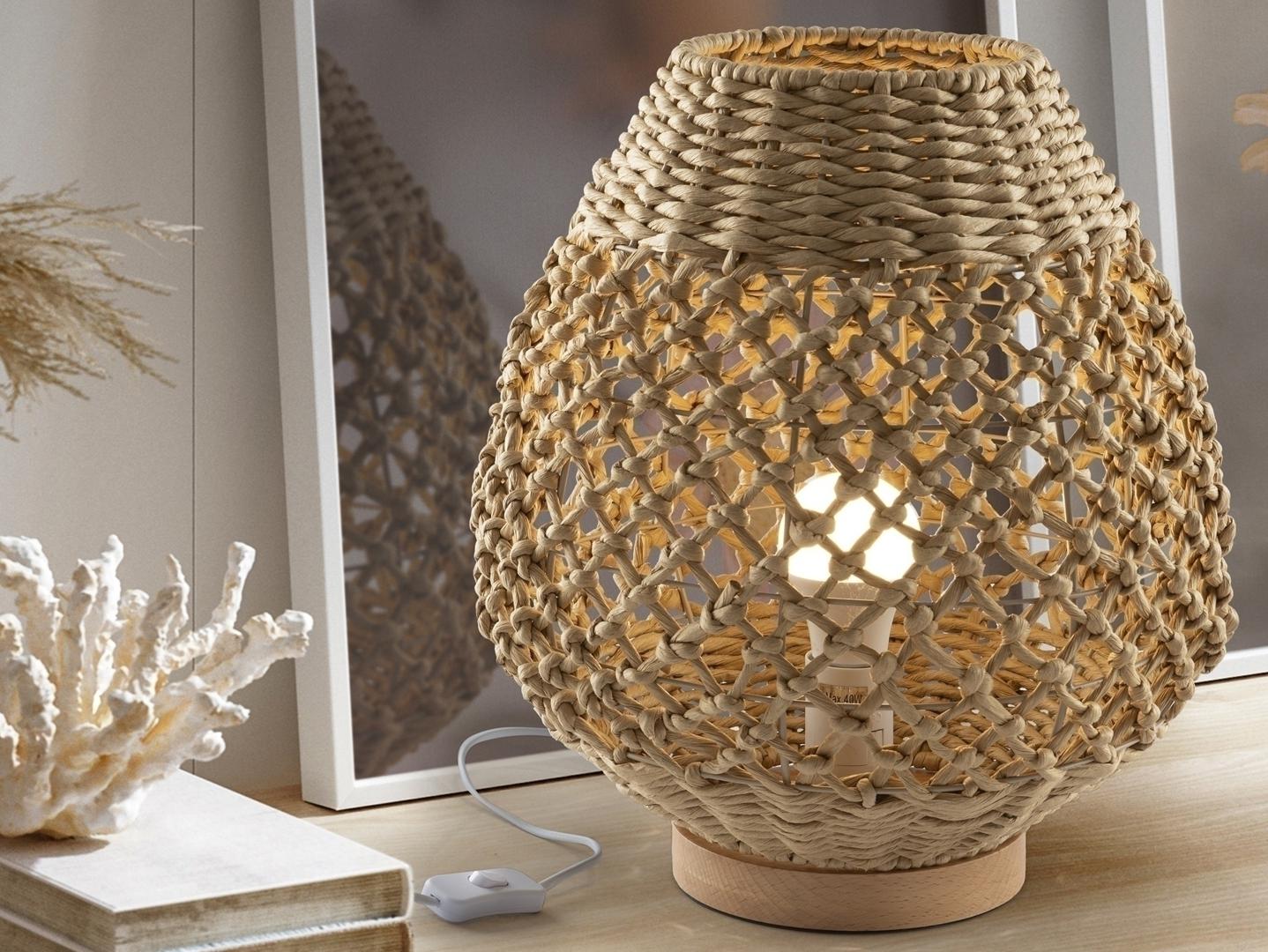 Большая настольная лампа на 1 лампу из металла и дерева, с абажуром из плетеных бумажных веревок с бежевой отделкой. ·В комплект входит 1 светодиод E27 мощностью 10 Вт.