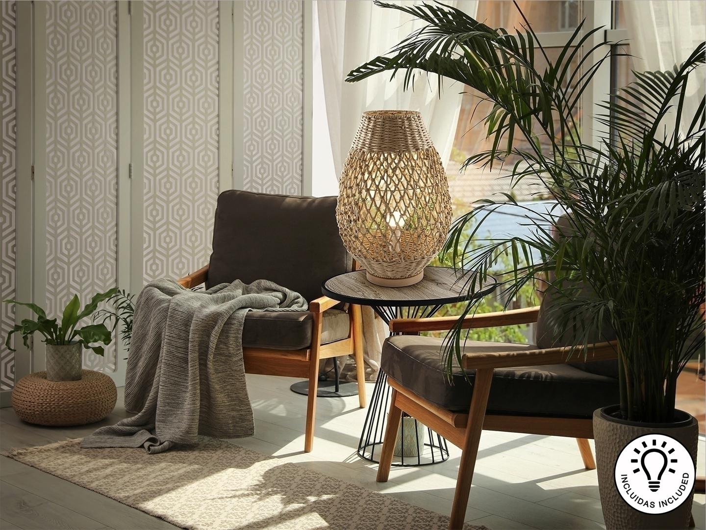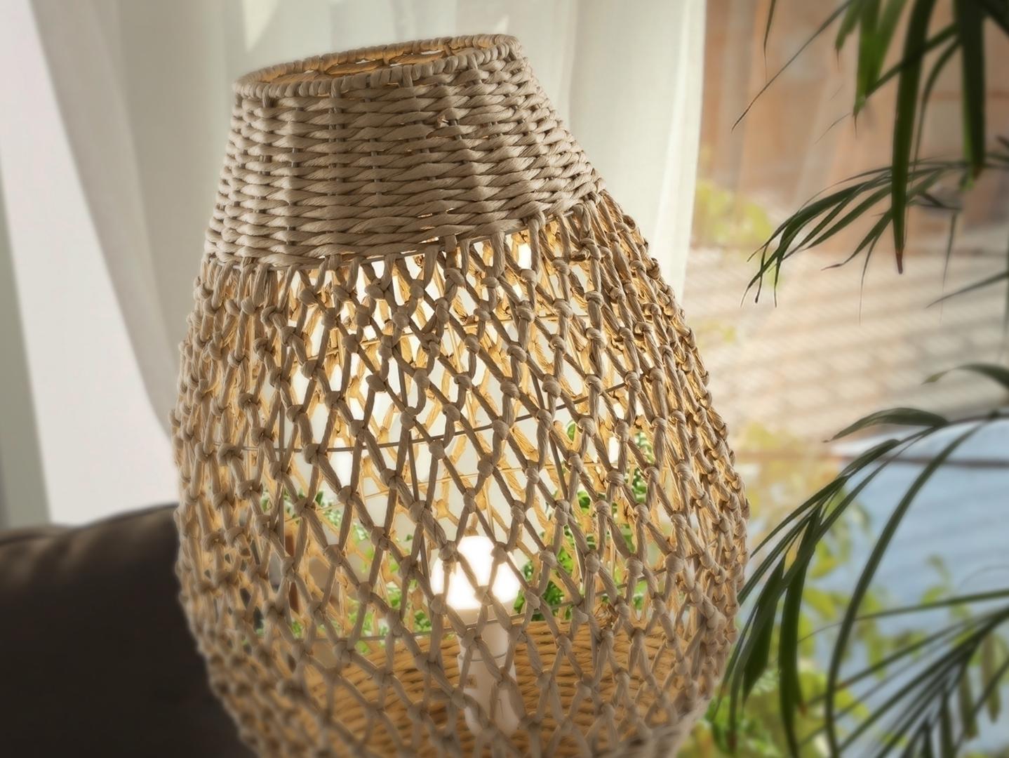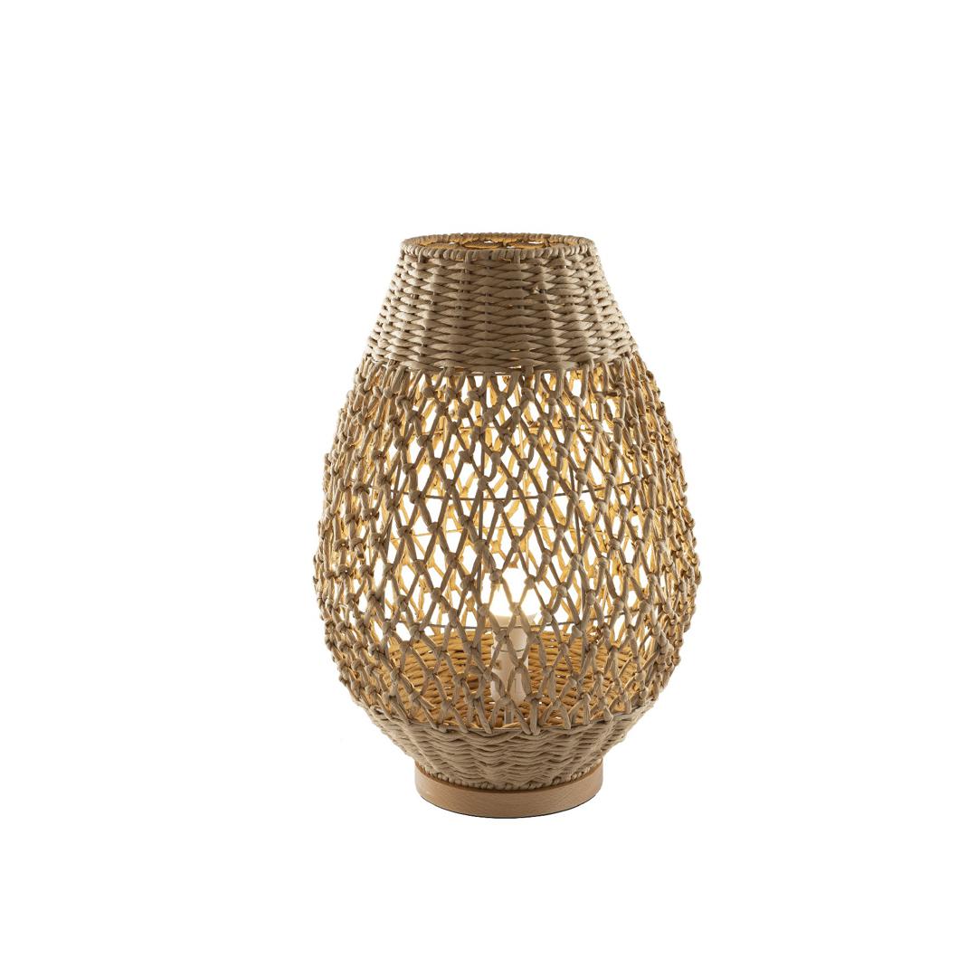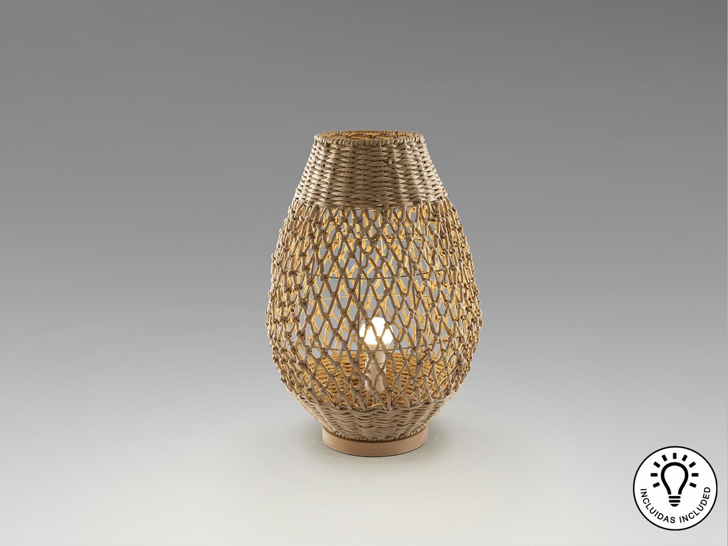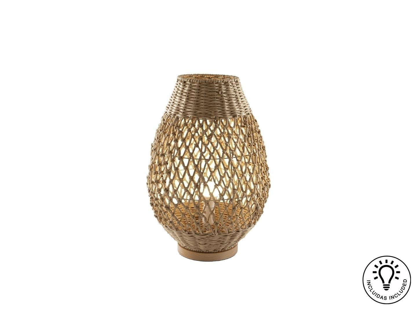 Большая настольная лампа на 1 лампу из металла и дерева, с абажуром из плетеных бумажных веревок с бежевой отделкой. ·В комплект входит 1 светодиод E27 мощностью 10 Вт.