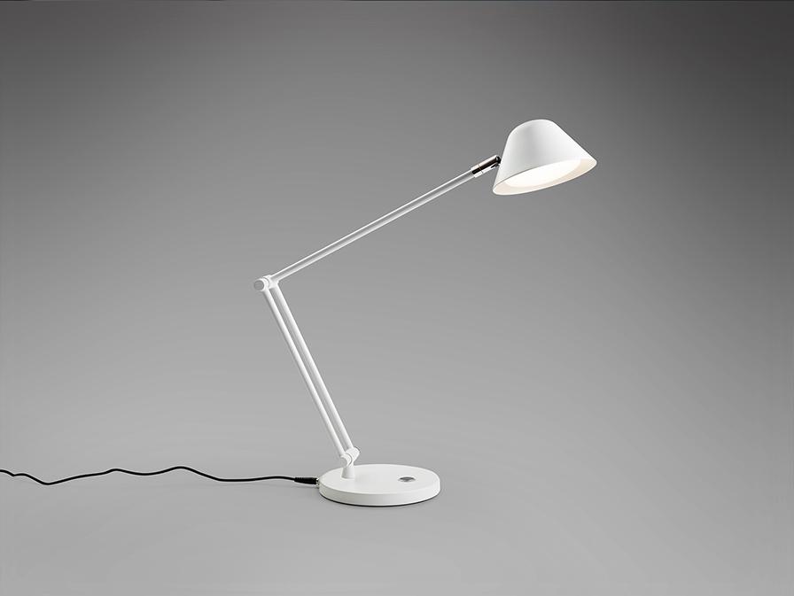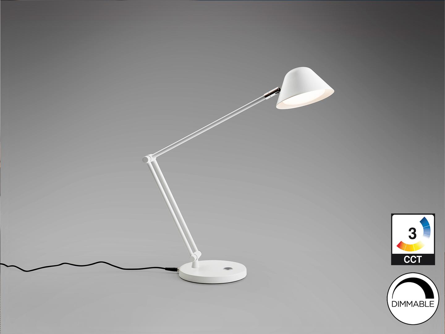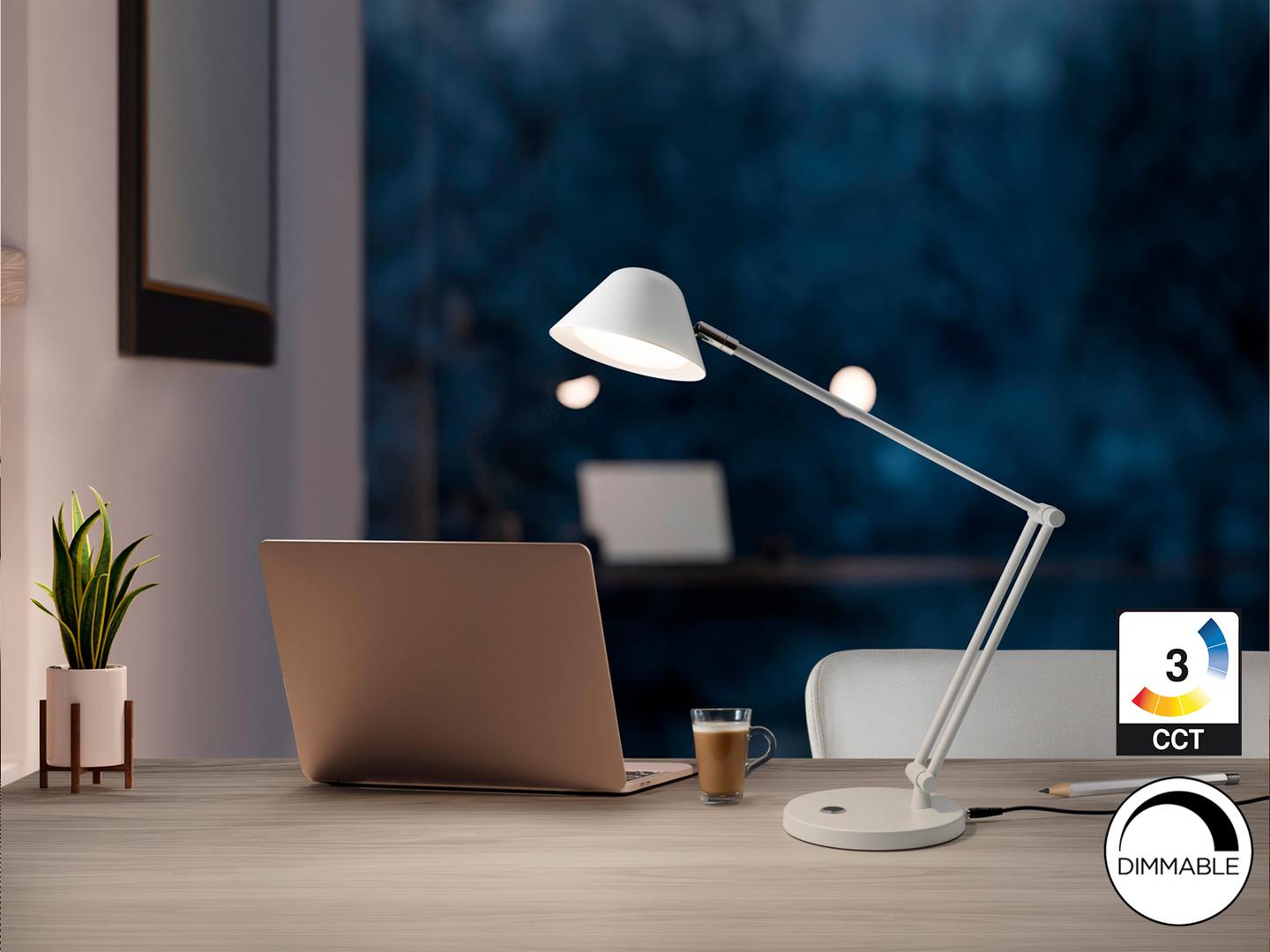 Настольная лампа с шарнирным кронштейном, изготовлена из металла и алюминия, матово-белая отделка. Тактильная кнопка. Регулируемый свет, регулируемая цветовая температура. Светодиод 10 Вт, 900 лм, CCT 3000K-6500K