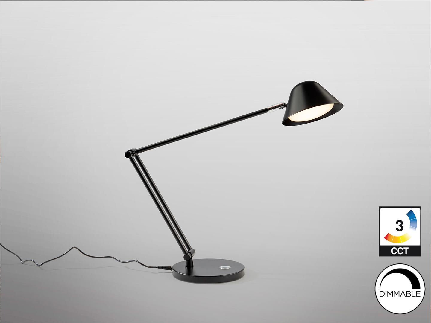 Настольная лампа с шарнирным кронштейном, изготовлена из металла и алюминия, матово-черная отделка. Тактильная кнопка. Регулируемый свет, регулируемая цветовая температура. Светодиод 10 Вт, 900 лм, CCT 3000-6500K
