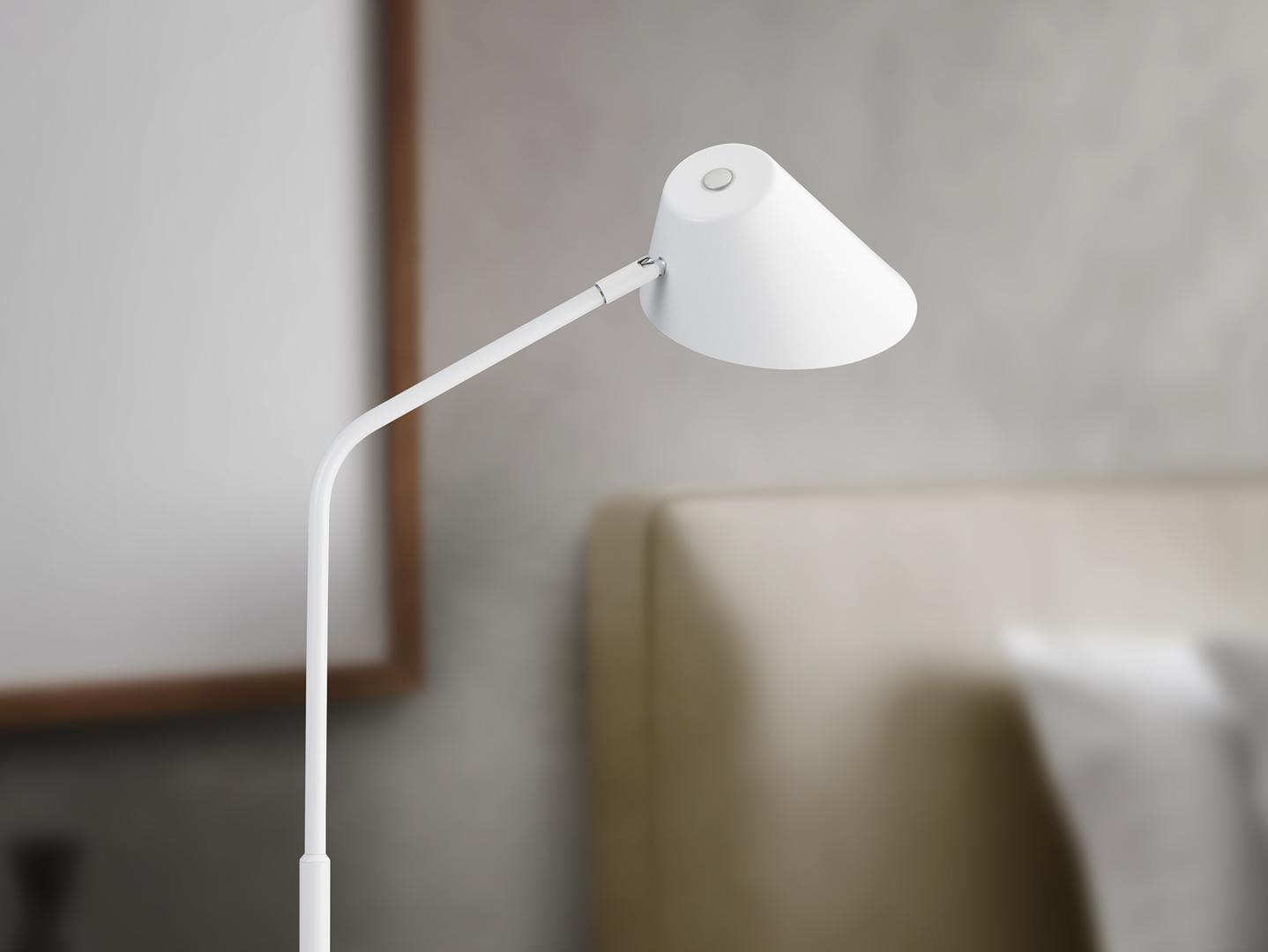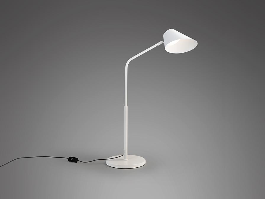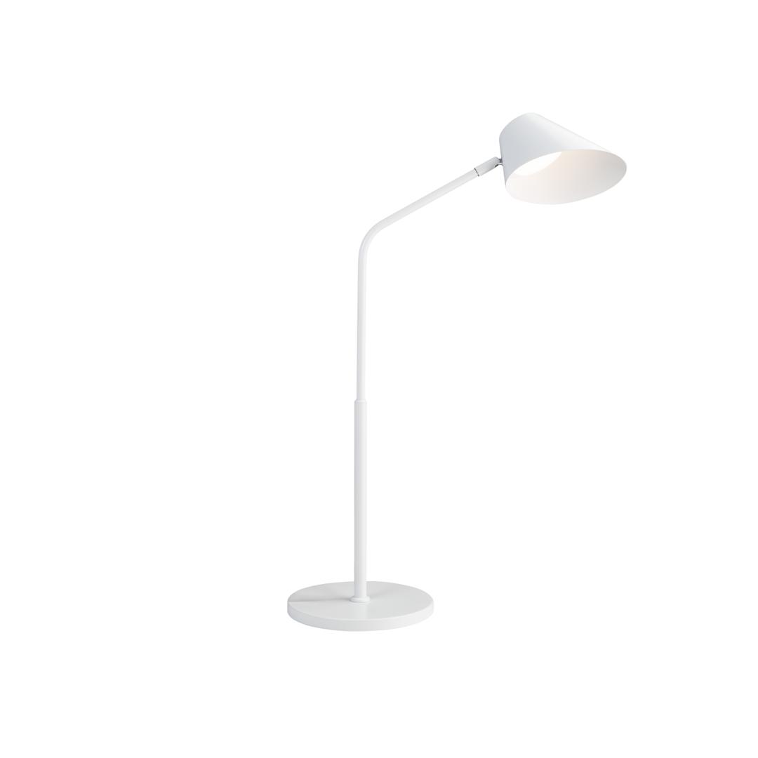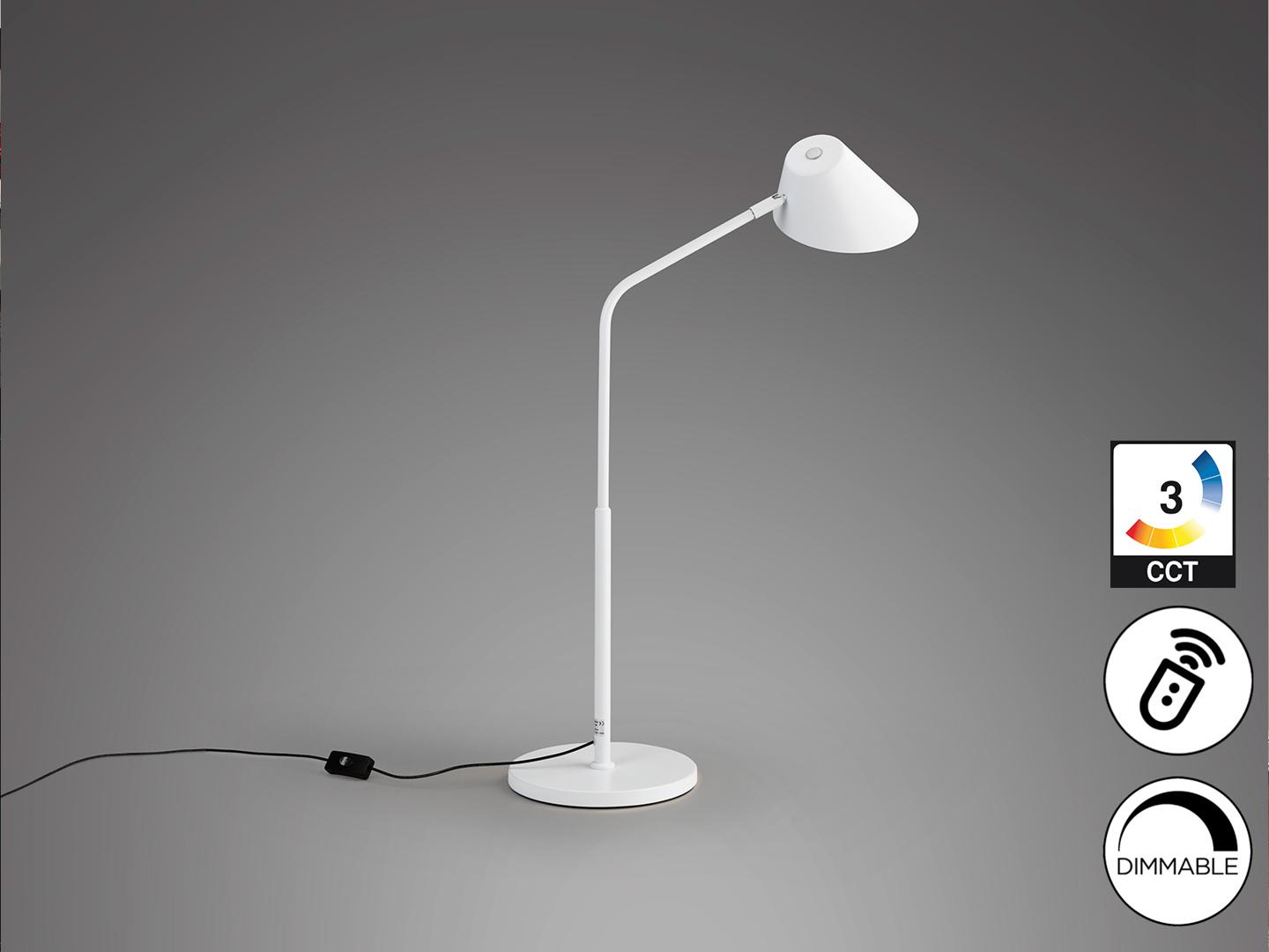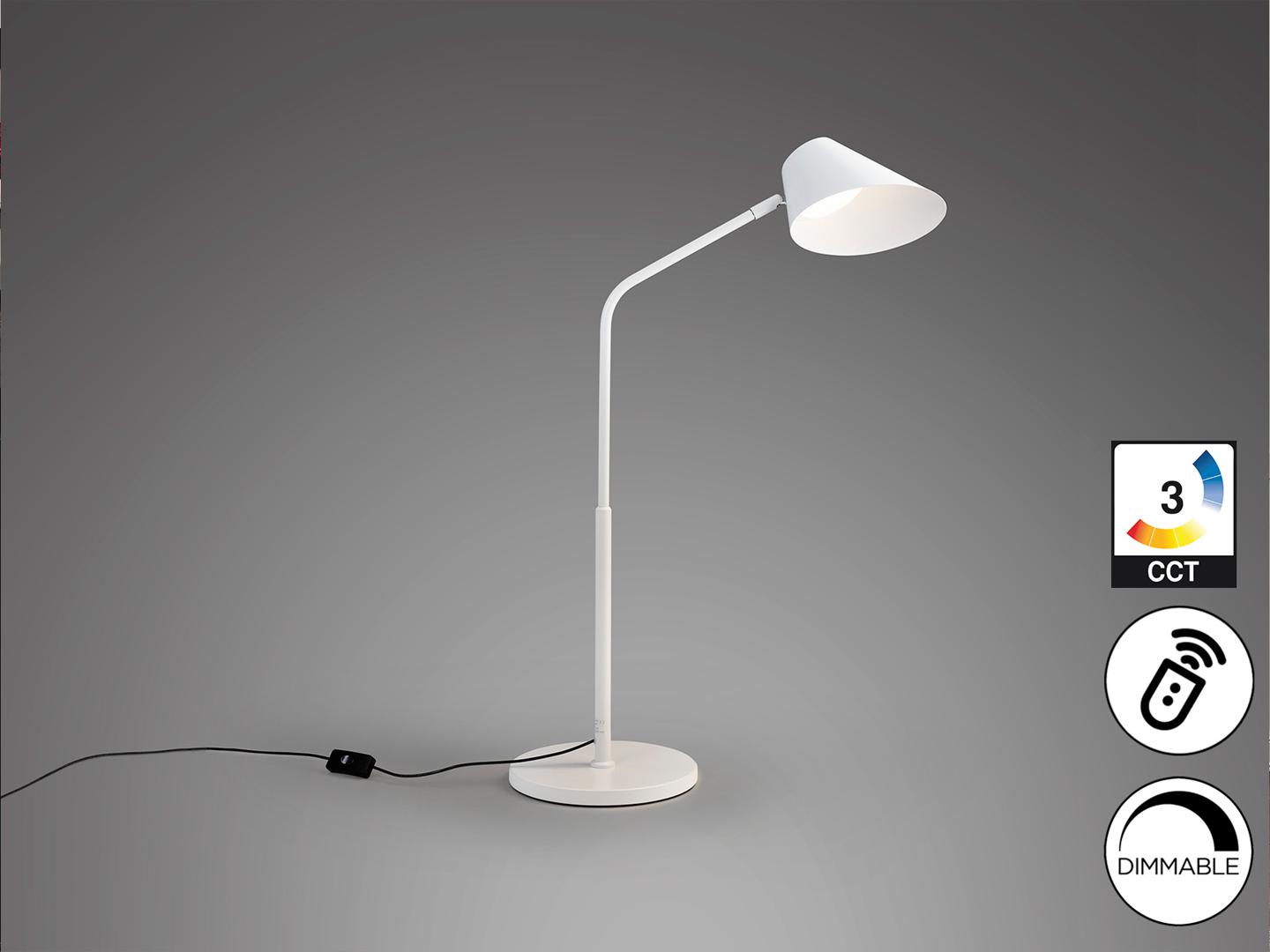 Настольная лампа из металла и алюминия, матово-белая отделка, опаловый рассеиватель. Тактильная кнопка и ПУЛЬТ ДИСТАНЦИОННОГО УПРАВЛЕНИЯ. Регулируемый прожектор, регулировка яркости света, регулируемая цветовая температура. Светодиод 12 Вт, 1300 лм, CCT 3000K-6500K