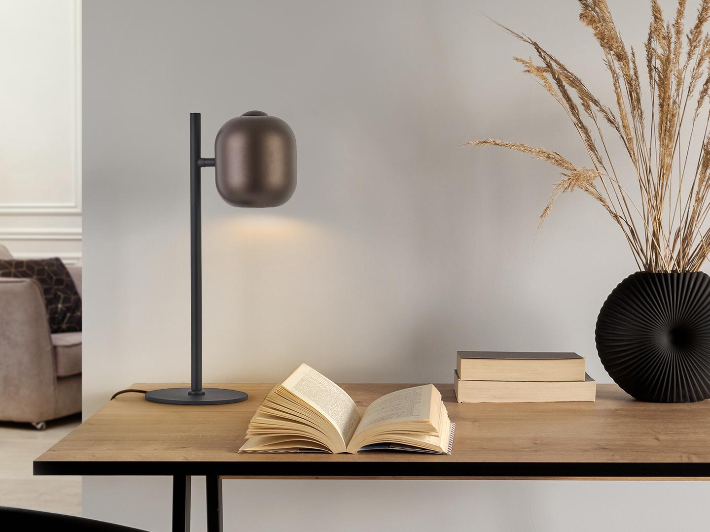 Настольная лампа из металла матово-черного цвета. Абажур металлический темно-коричневого цвета. Патрон GU10.