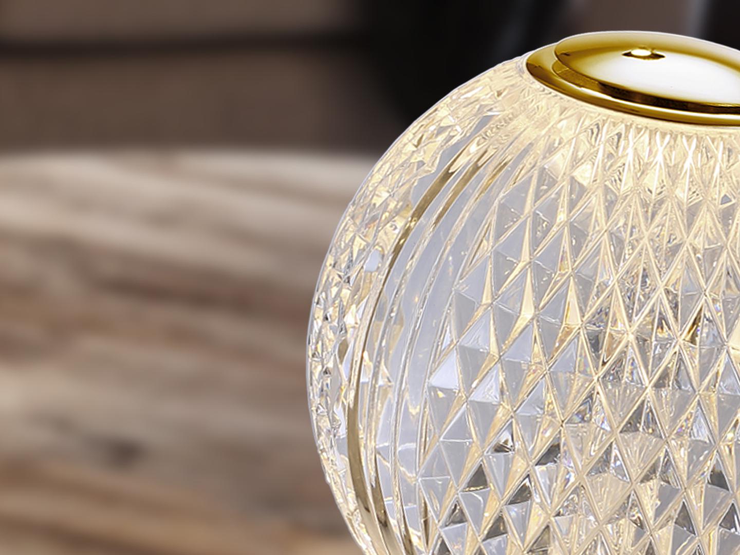 Настольная лампа с 1 светодиодной лампой, металлическая, с золотым покрытием. Сферический абажур диаметром 9 см из прозрачного оптического акрила, имитирующего резной хрусталь. Аккумуляторная, USB-кабель в комплекте. Светодиод мощностью 1,5 Вт. Цветовая температура 3000 К. Цветовая температура 112 лм.