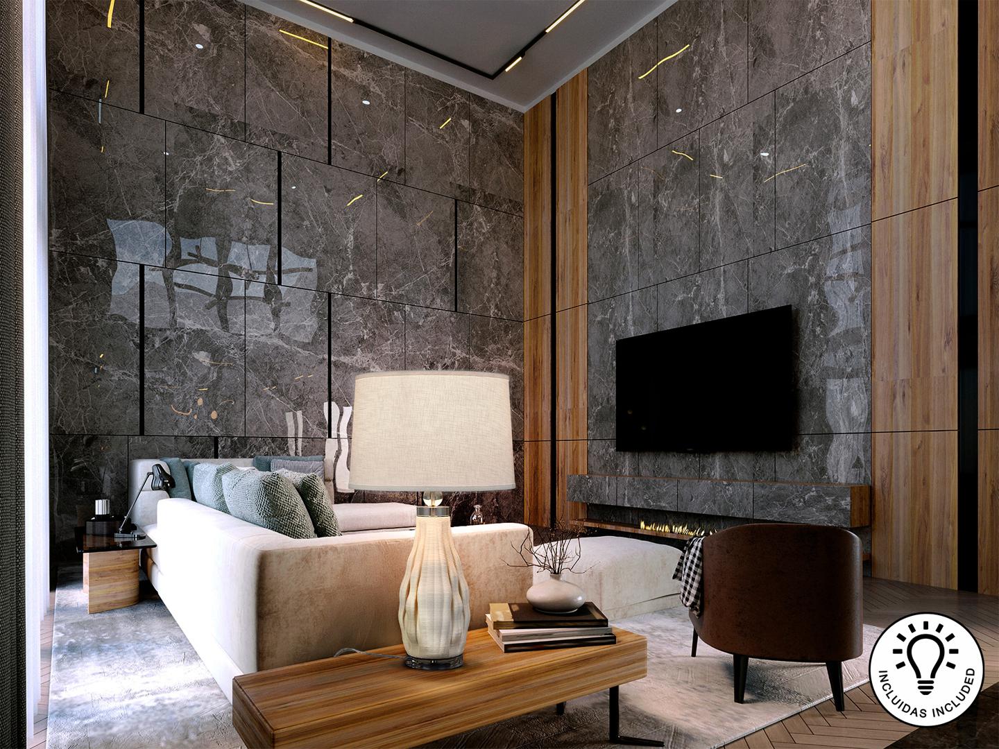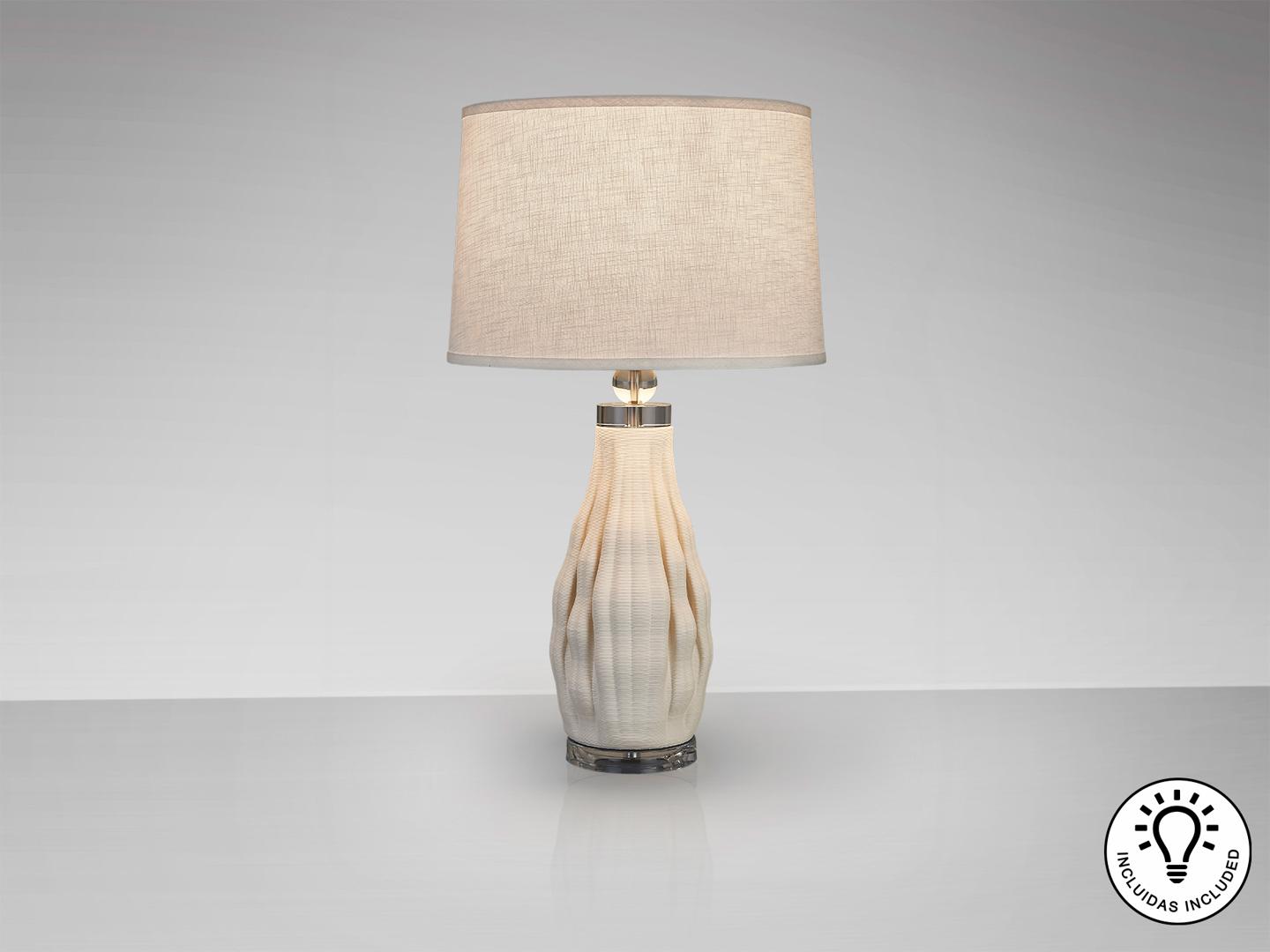 Настольная лампа на 1 лампу. Изготовлена из керамики белого цвета, напечатанной на 3D-принтере, с основанием из прозрачного акрила и хромированным металлом. Абажур из белого текстиля. ·В комплект входит 1 светодиод E27 мощностью 10 Вт.