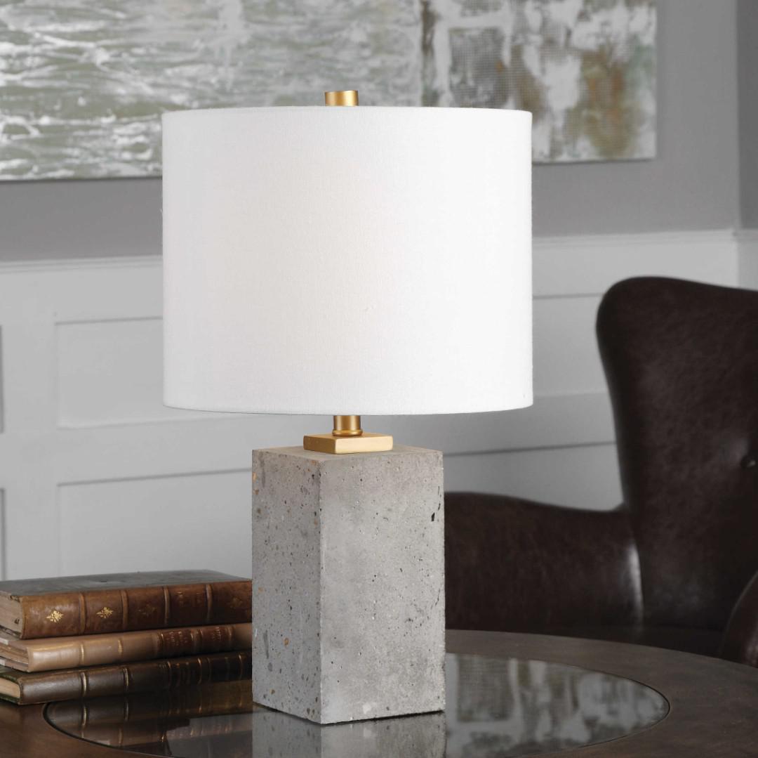 Интересная настольная лампа, что несомненно придется по вкусу многим. Основание лампы сделано из толстого блока из пористого, слегка окрашенного бетона, украшенного деталями, выкрашенными щеткой под золото. Абажур в твердом переплете из белой льняной ткани.