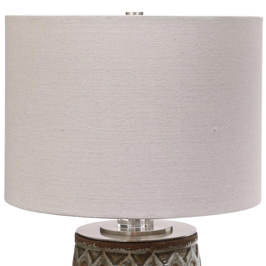 Чудесная настольная лампа. Выполнена из керамики с серо-голубой глазурью, с замысловатыми рельефными геометрическими деталями, дополнена акцентированными деталями из матового никеля и толстым хрустальным ободком. Абажур лампы выполнен из бежевой льняной ткани. Лампа станет прекрасным приобретением и отлично дополнит практически любой интерьер.