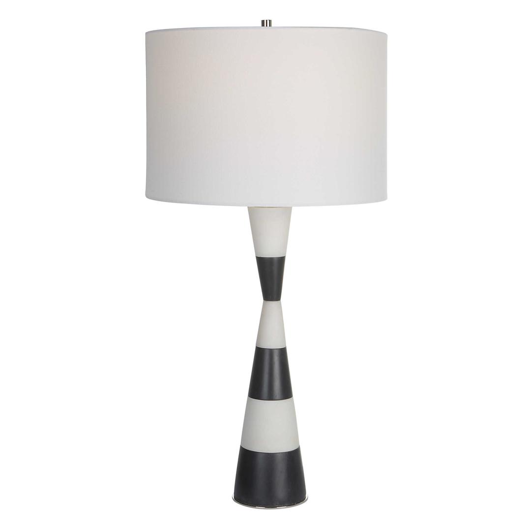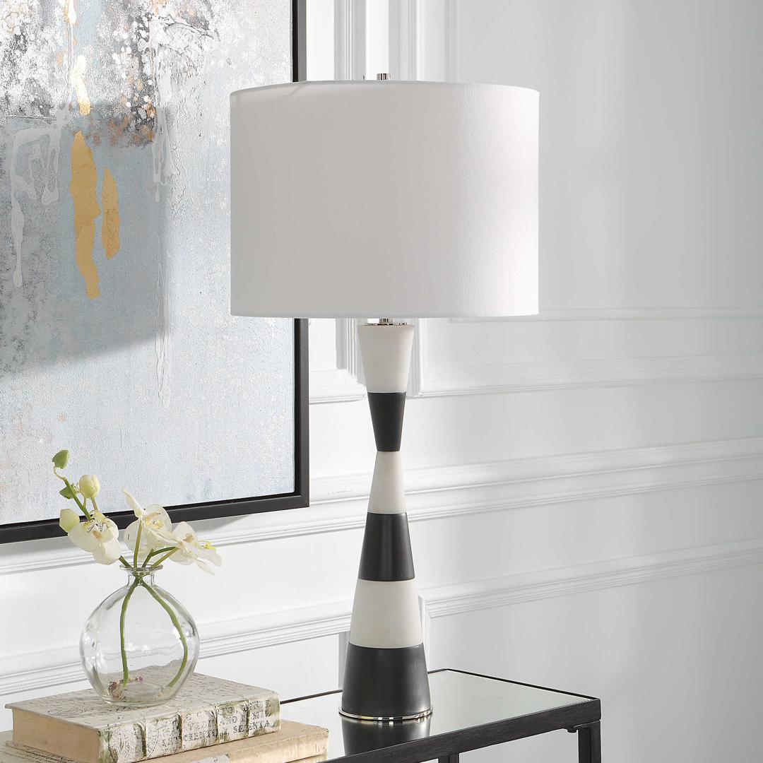 Интересная настольная лампа в современном стиле. Лампа изготовлена из искусственного камня с черной и белой полосой, который подчеркивает форму песочных часов и точно повторяет внешний вид мрамора Тасос. Небольшие металлические детали добавляют изюминку, а аккуратный абажур из льняной ткани отлично завершает всю картину.