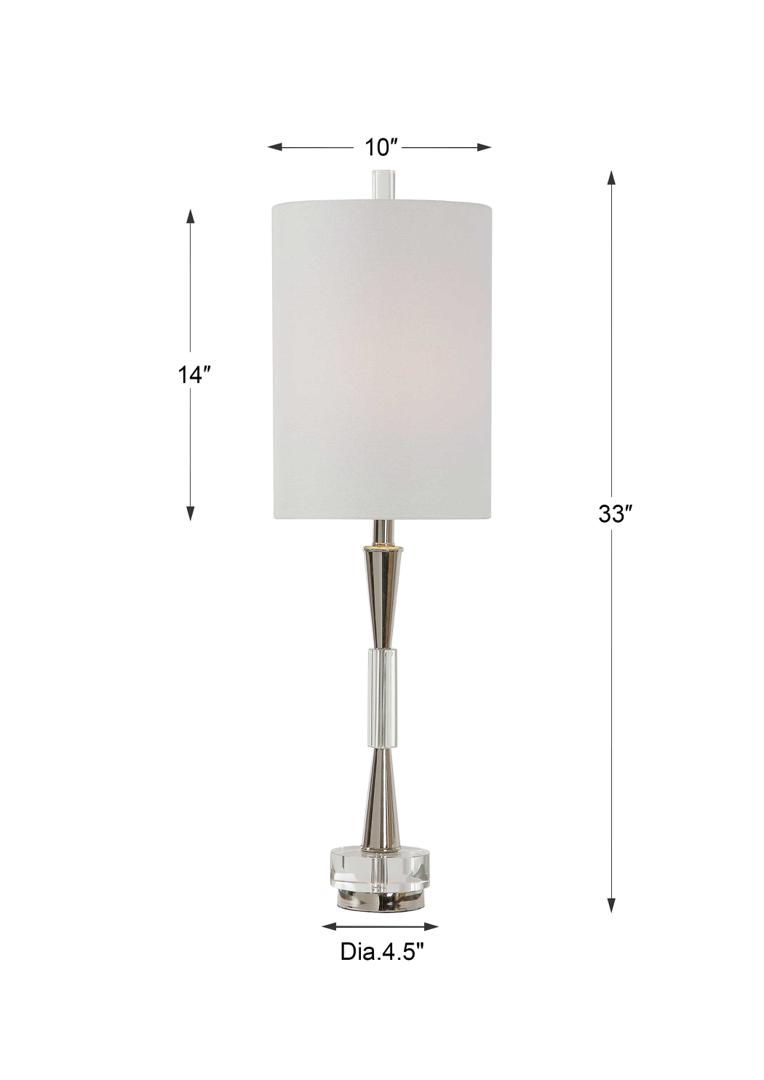 Очаровательная настольная лампа, выполненная в современном стиле. Лампа изготовлена из никеля и хрусталя. Абажур выполнен из белой льняной ткани. Такая лампа сумеет вписаться практически в любой интерьер, будь то современная или более классическая обстановка.