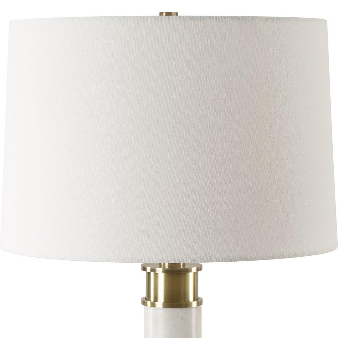 Чудесная настольная лампа из белого мрамора с тонкими прожилками, которая установлена на массивной хрустальной ножке и дополнена элементами из состаренной латуни с покрытием. Слегка зауженный абажур из белоснежной льняной ткани прекрасно дополняет изделие.
