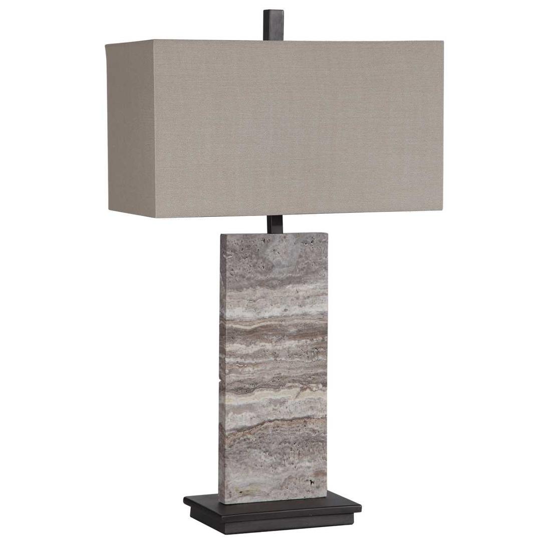 Эта простая, но изысканная настольная лампа выполнена из большого мраморного слэба с естественными полосами серого, бежевого и цвета слоновой кости, установленного на толстой железной ножке с покрытием из окисленной темной бронзы. Прямоугольный абажур обтянут бежевой льняной тканью с естественным тиснением. Благодаря натуральности камня, каждый светильник различается по цвету и имеет множество полостей, в которых изначально находились окаменелые раковины.