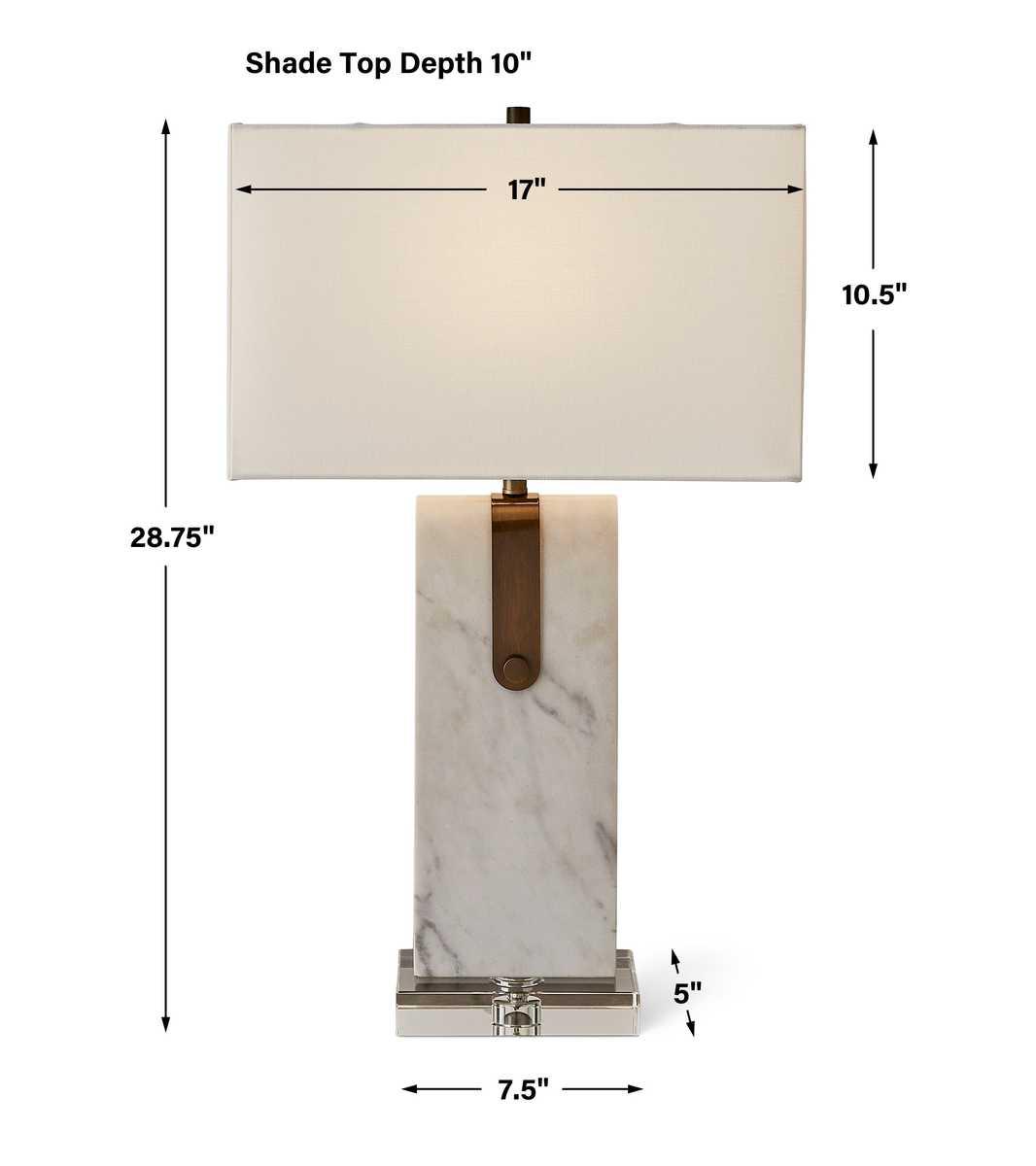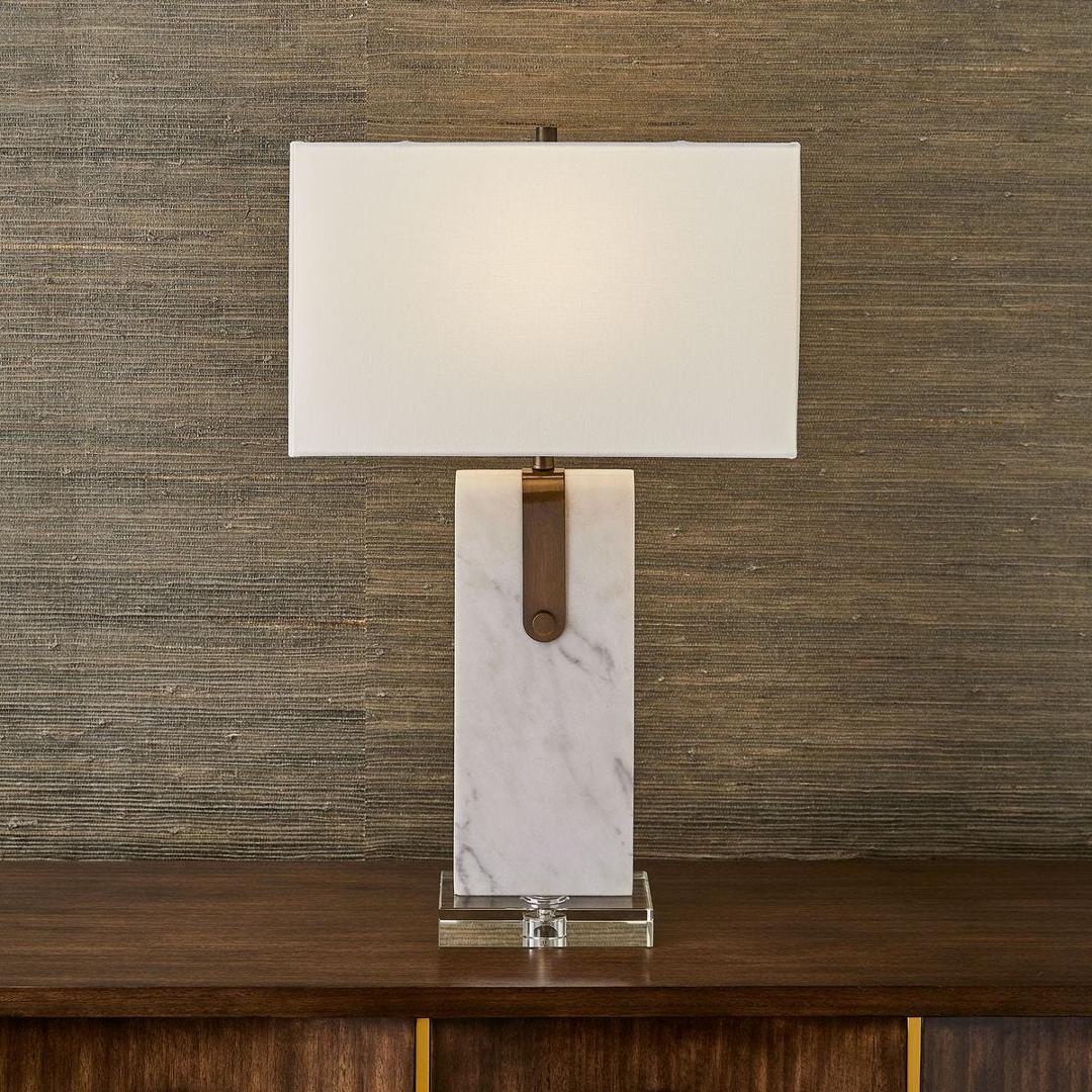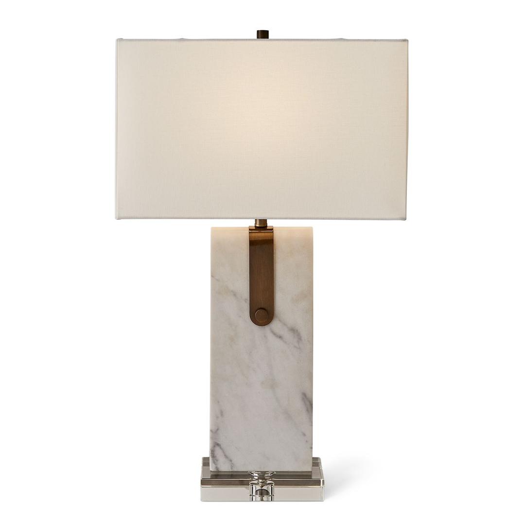 Строгий и лаконичный облик настольной лампы подчёркивается деталями изысканной по своему мраморной столешницы, обёрнутой железным зажимом. Прямоугольная форма толстого хрустального основания и простой тканевый абажур позволяют лампе гармонично вписаться в любой интерьер. Строгая изысканность всегда в моде.