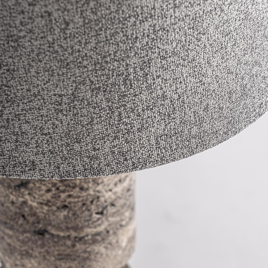 Настольная лампа в стиле ар-деко, выполнена из нейтрального травертина в сочетании с серебристым железом и серым льном. Изделие можно разобрать. Ширина: 30см, Глубина: 30см, Высота: 59см