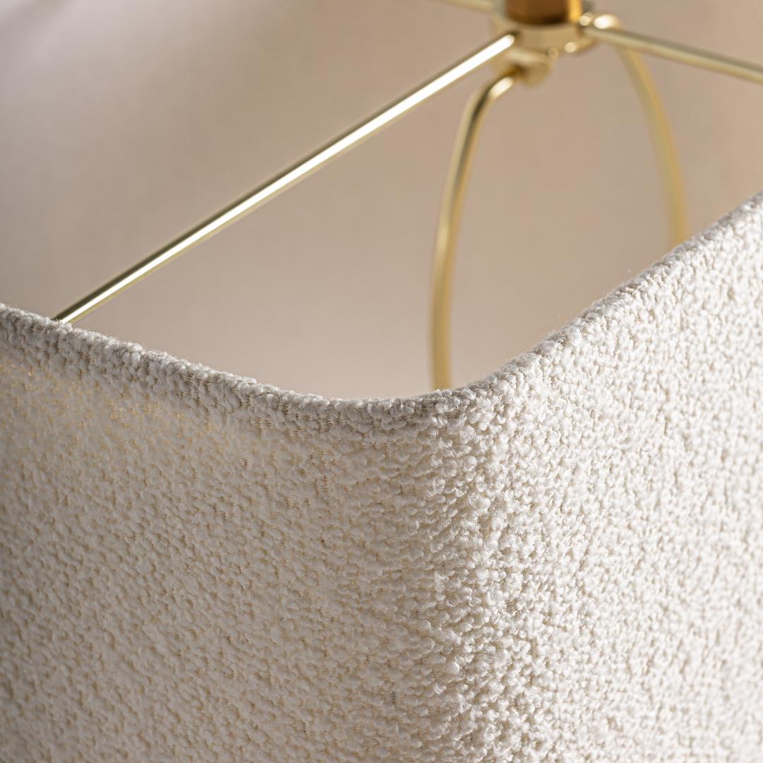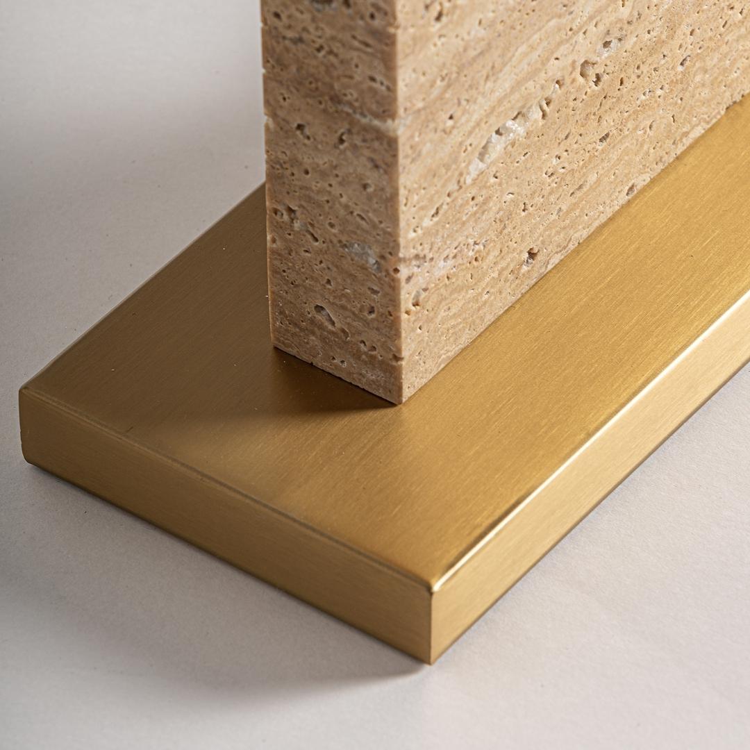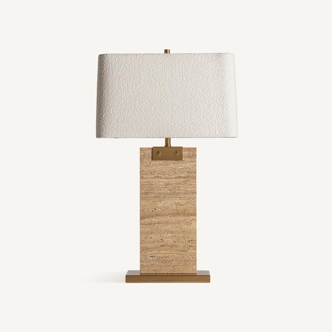 Настольная лампа бежевого цвета в стиле ар-деко. Изготовлена из железа в сочетании с травертином и хлопком-букле. Съемное изделие.