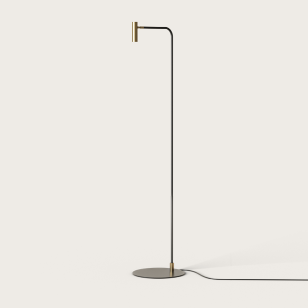 Торшер Maho с матовым черным металлическим основанием и регулируемым металлическим плафоном в золотом или матовом черном цвете. С сенсорным регулятором на головке. Светодиод включен.