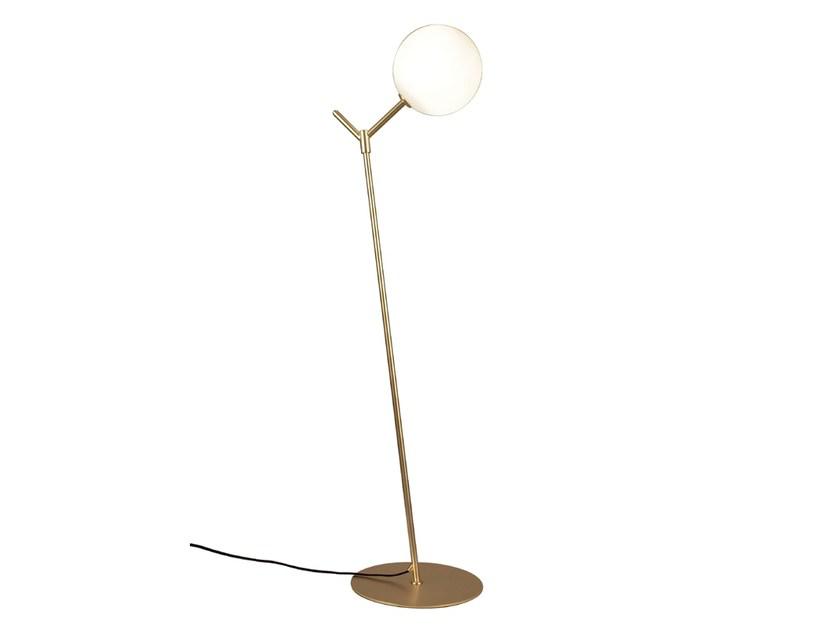 Напольный светильник с круглым плафоном из выдувного стекла и ножкой, изготовленной из метала черного или латунного цвета.