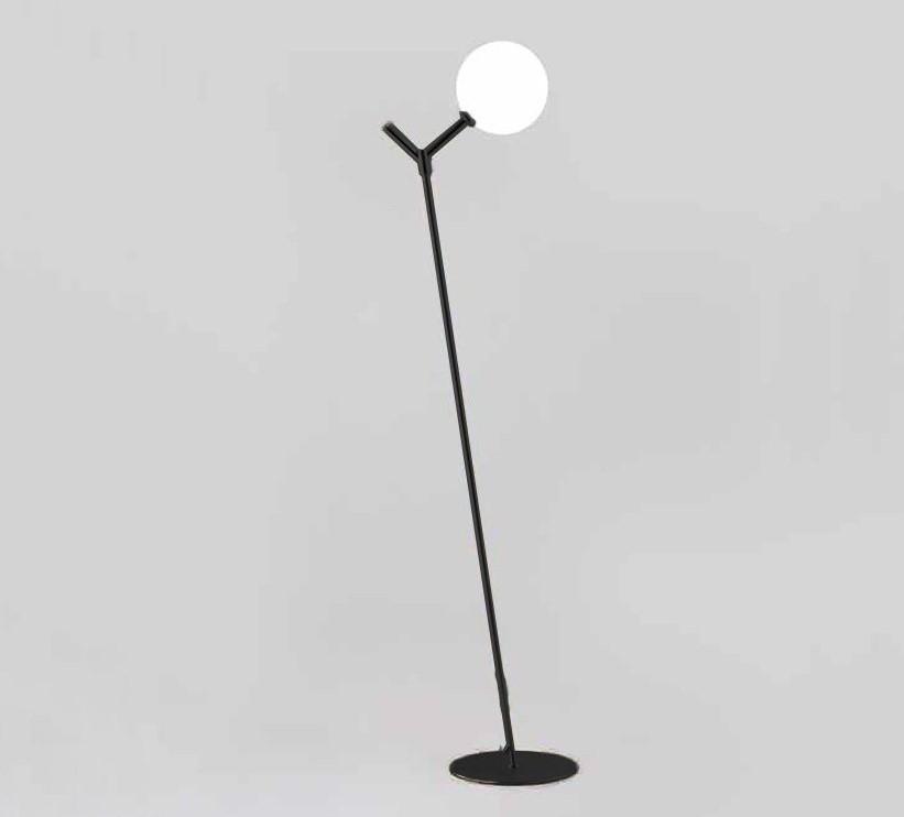 Напольный светильник с круглым плафоном из выдувного стекла и ножкой, изготовленной из метала черного или латунного цвета.