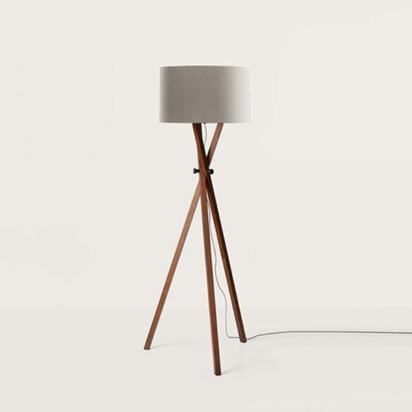 Торшер из орехового дерева на треноге с черным или белым абажуром из хлопка.
