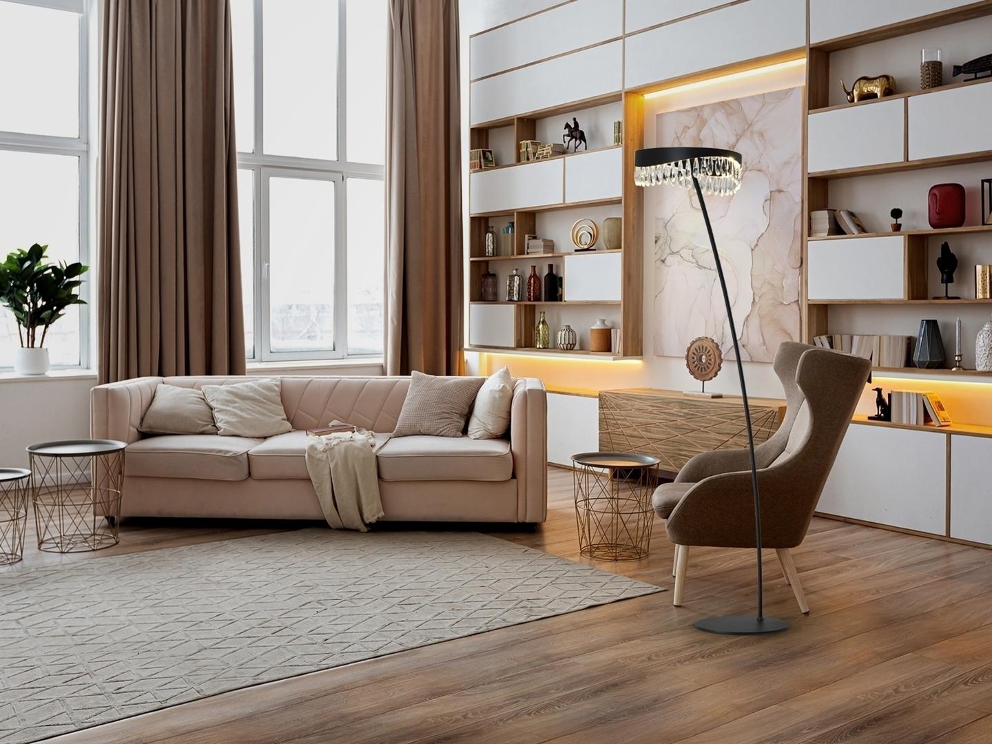 Торшер из металла и алюминия, окрашенный в черный матовый цвет. Рассеиватель из граненых хрустальных капель. Светодиодное освещение 20Вт, 800Лм, 3000К.