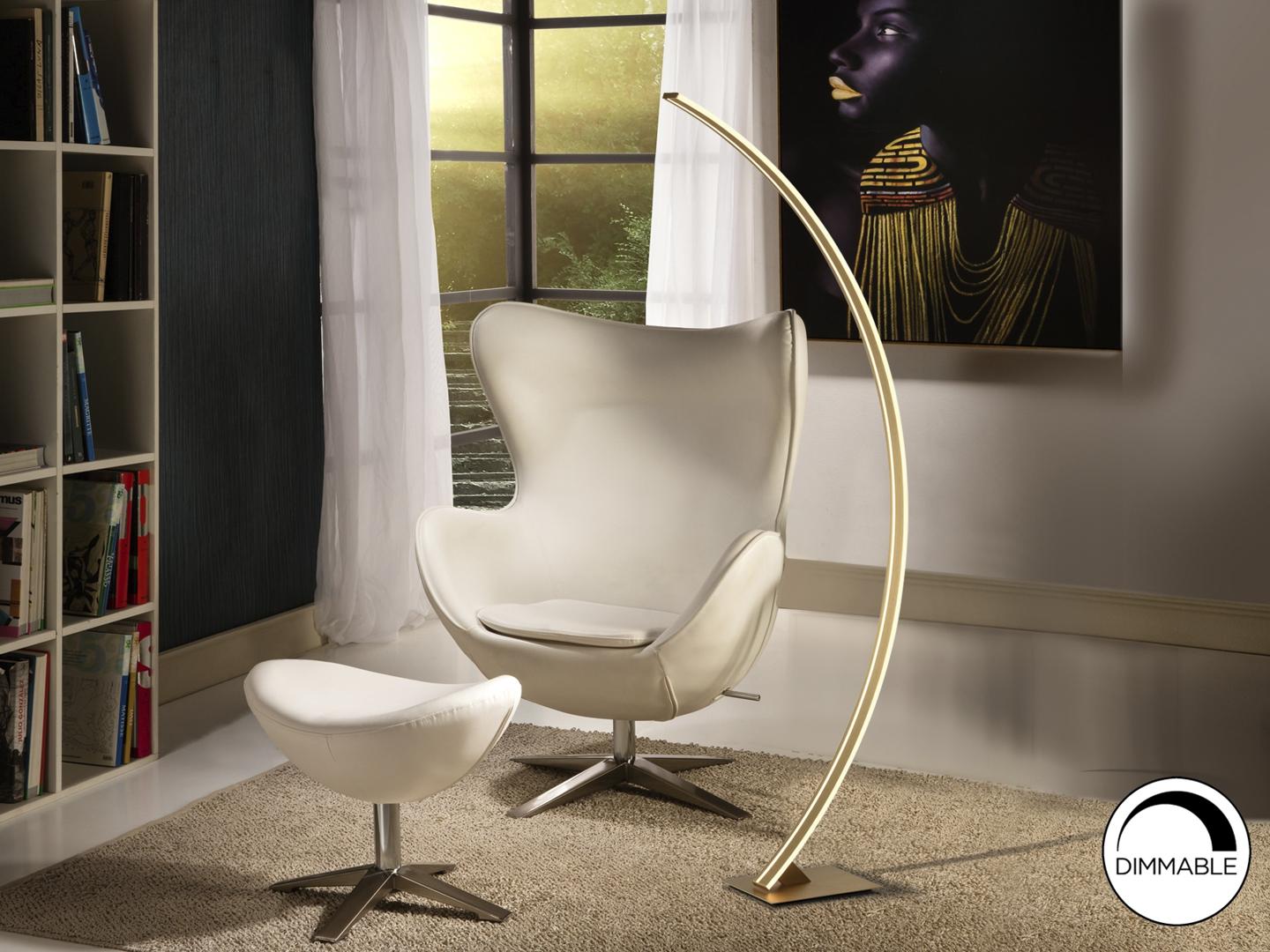 Торшер LED из металла и алюминия, золотистое покрытие с матовой полировкой. Опаловый силиконовый рассеиватель, 38W LED, 1800 Lm, 3000 K.