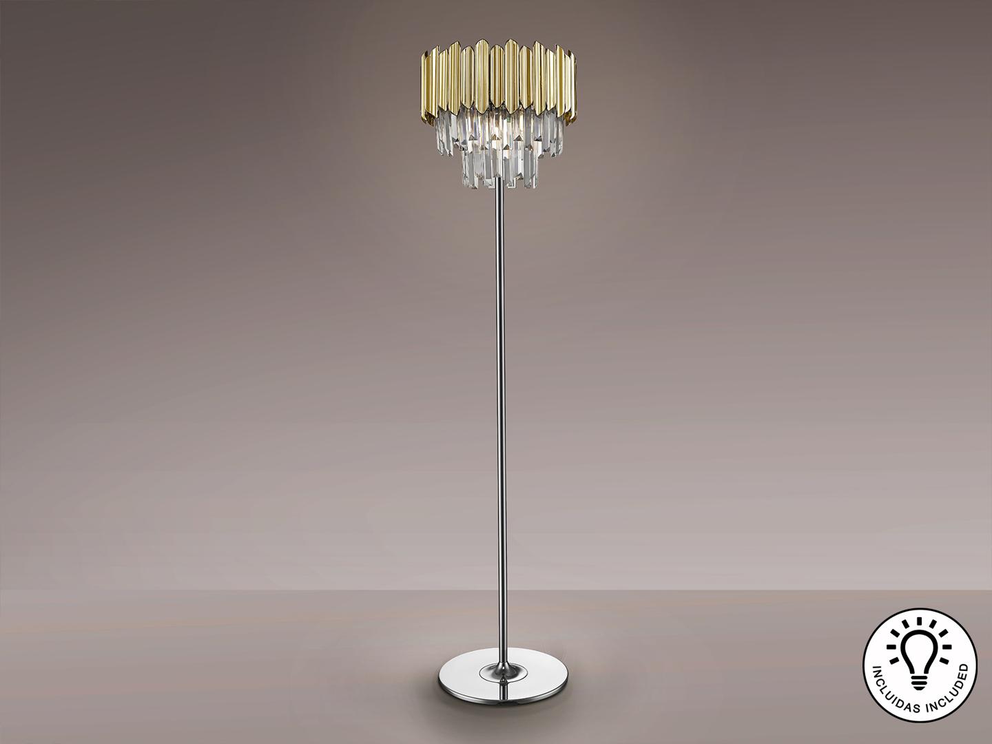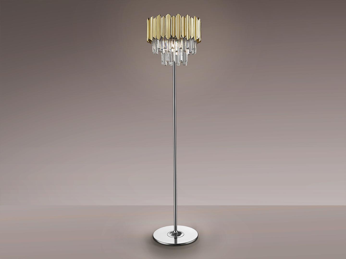 Торшер из металла, хромированная отделка. Абажур из граненых стеклянных призм с деталями из АБС-пластика с позолоченным покрытием. ·В комплект поставки входят 3 светодиода G9 мощностью 6 Вт.