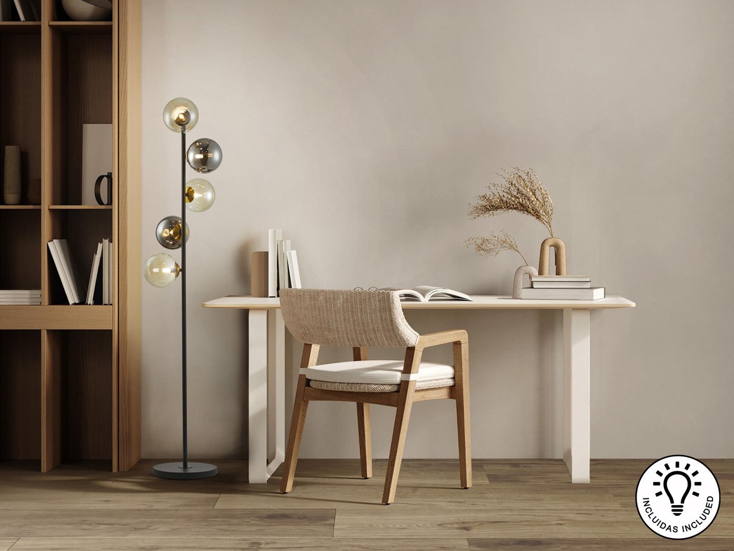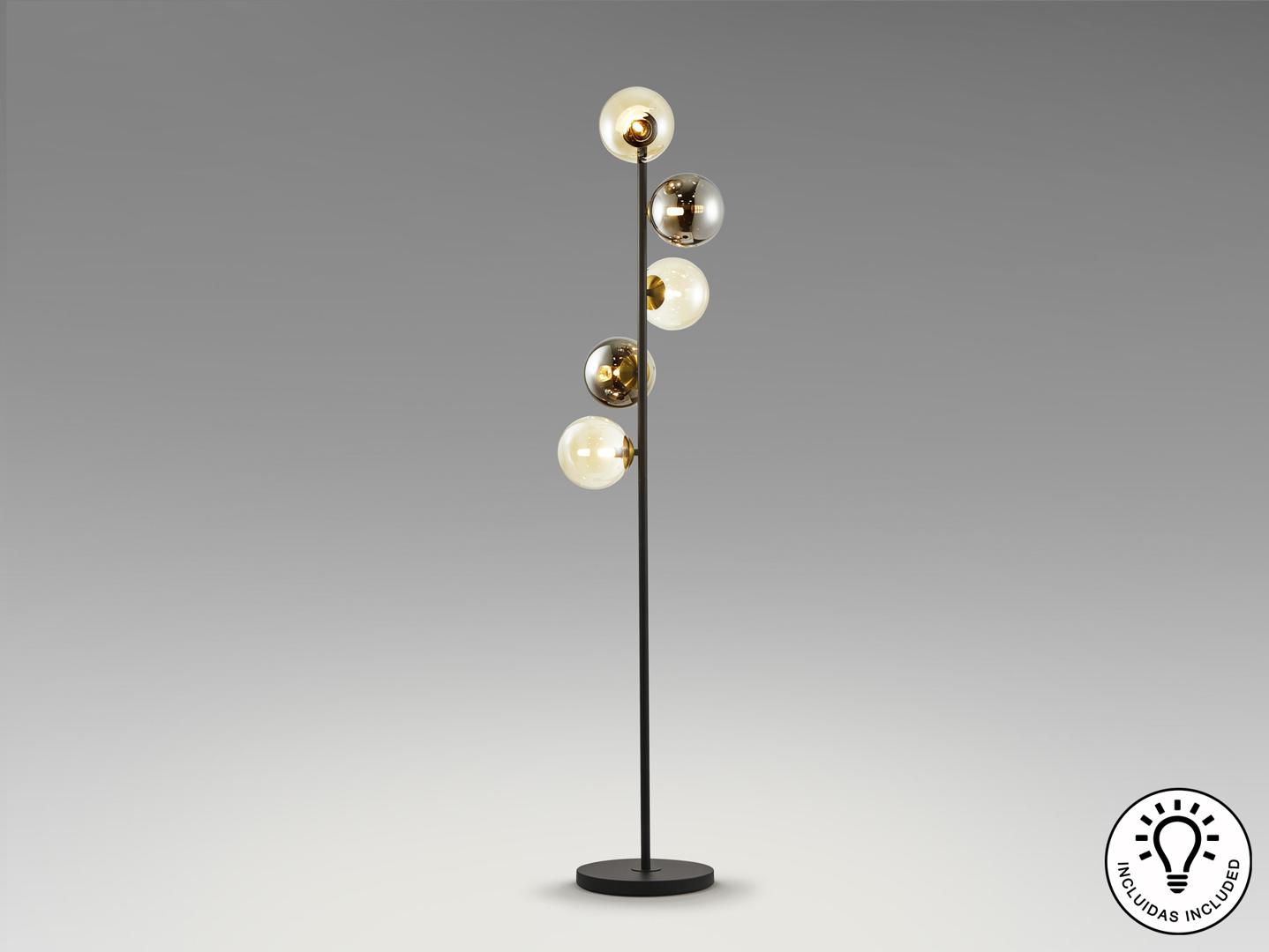 Торшер из металла, матово-черного и сатинированного латунного цвета. Сферические абажуры янтарного и мерцающего дымчато-серого цветов. ·В комплект входят 5 светодиодов G9 мощностью 4 Вт.