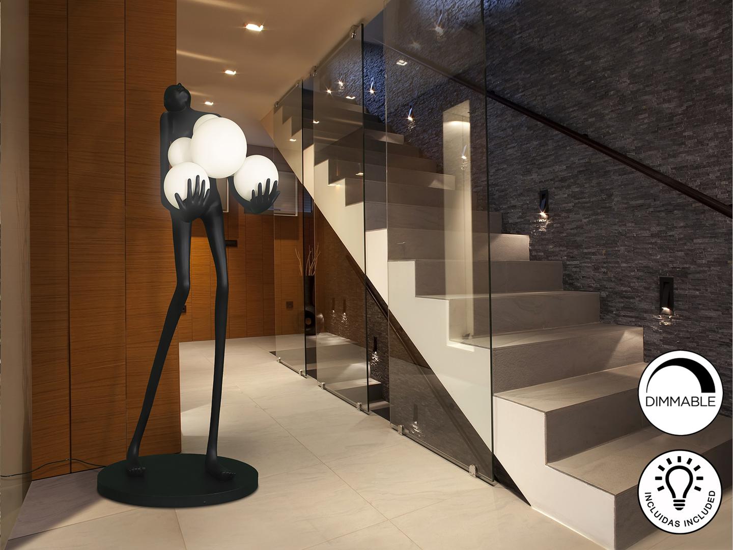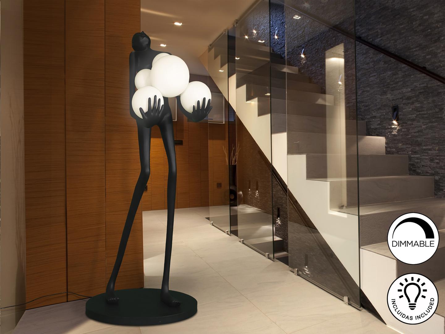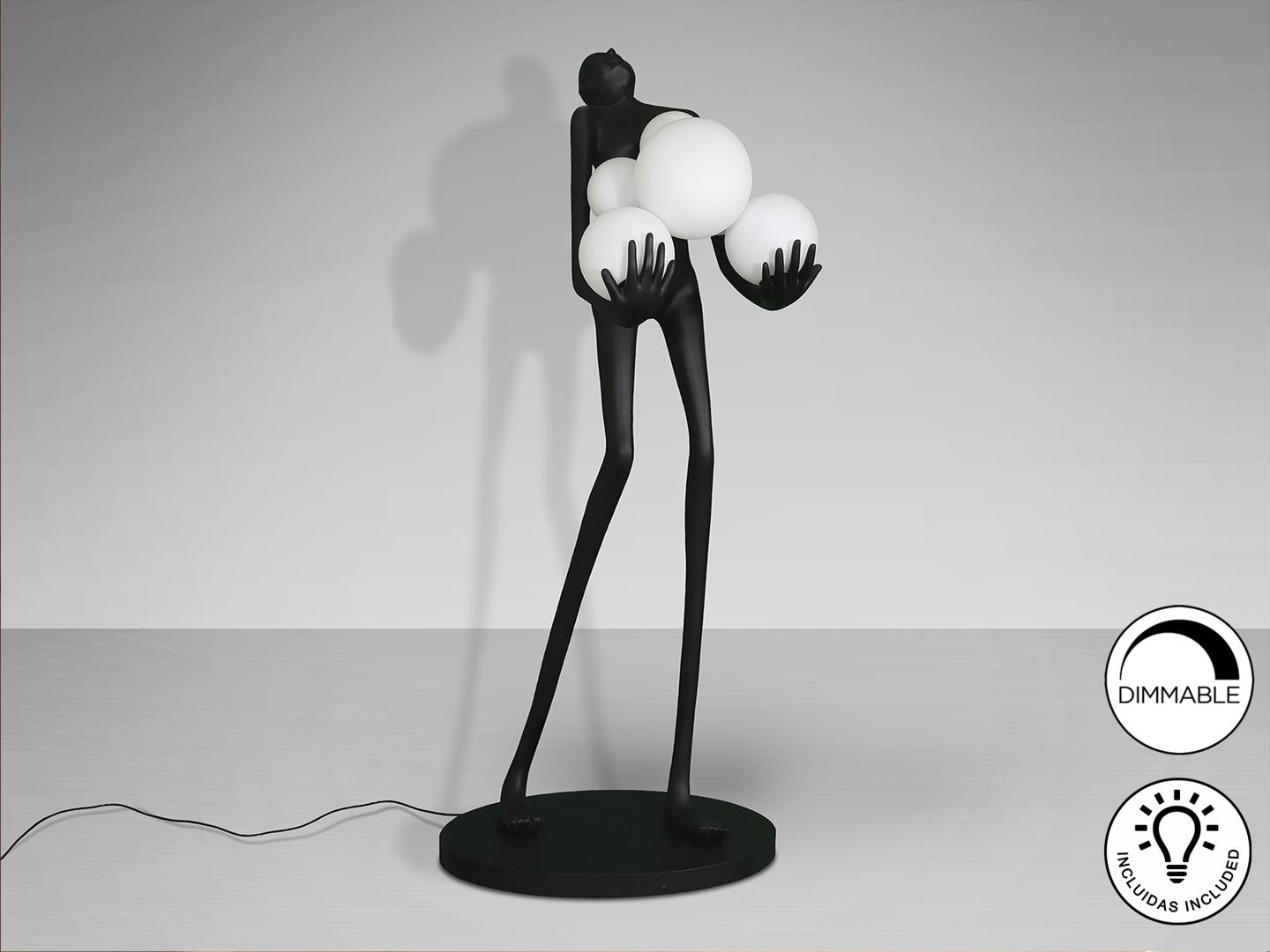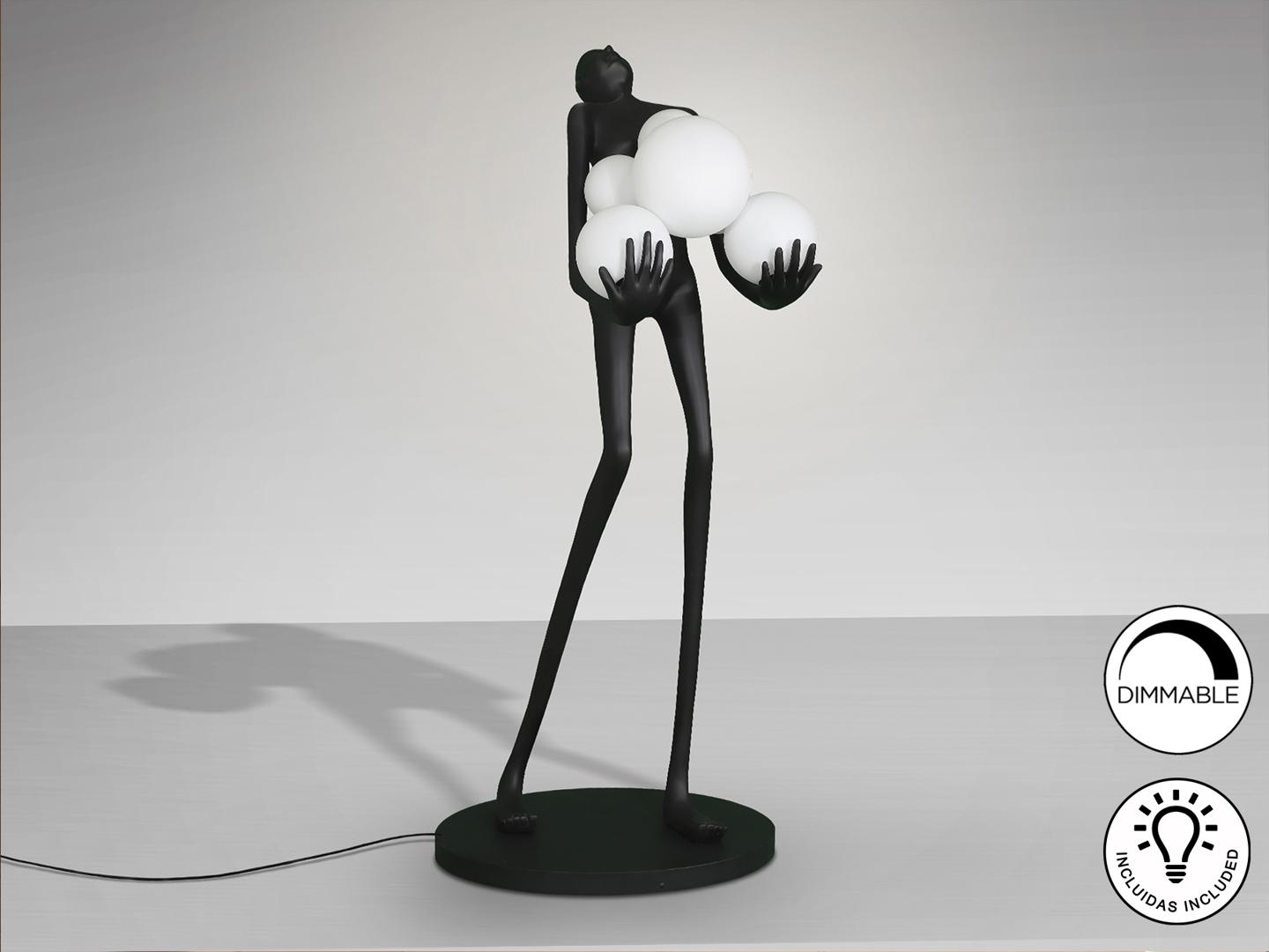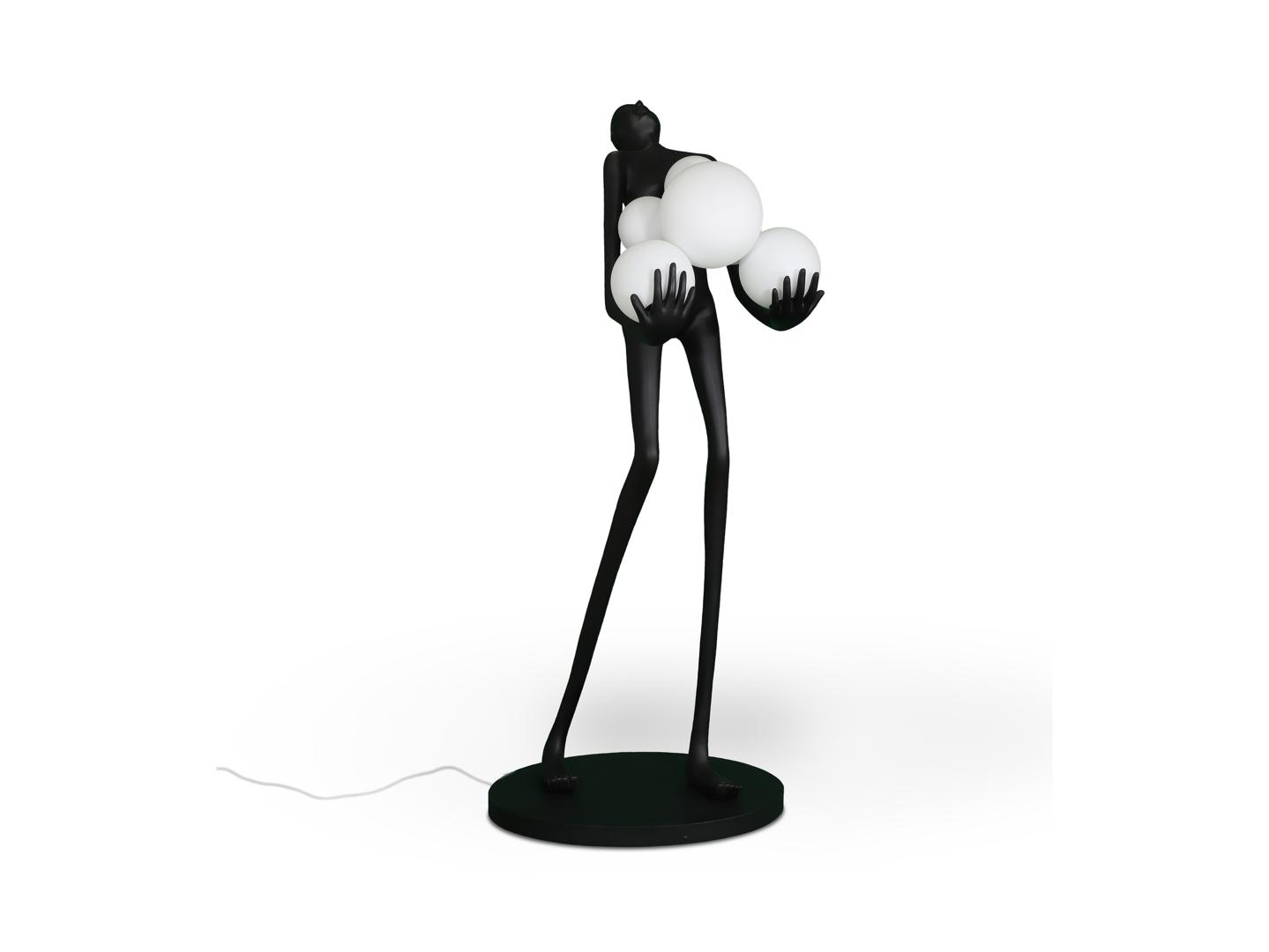 Фигура изготовлена из стекловолокна и полиэфирной смолы, матово-черная отделка, сферические плафоны из акрилового стекла с матово-опаловой отделкой. ·В комплект входят 6 светодиодов E27 мощностью 7 Вт. РЕГУЛИРУЕМАЯ ЯРКОСТЬ
