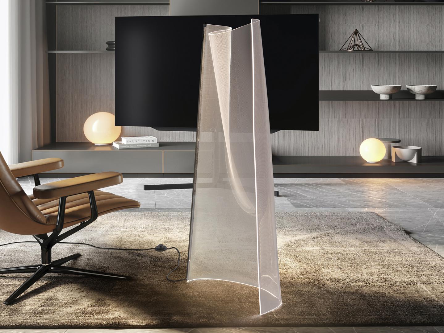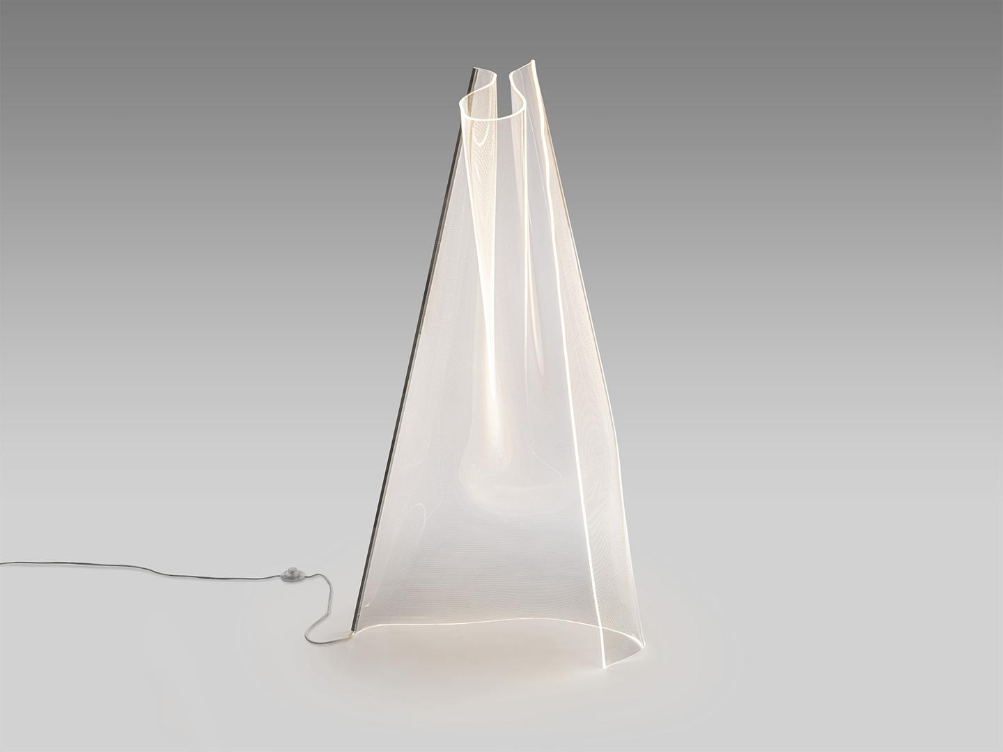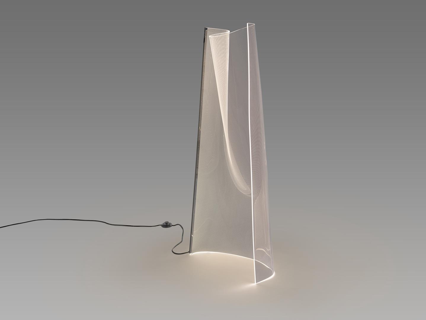 Напольный светильник, состоящий из листа формованного микропечатного метакрилата и хромированного металлического профиля. Светодиодное освещение 24 Вт, 1500 лм, 3000 К.