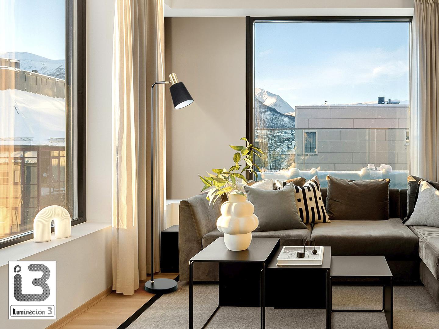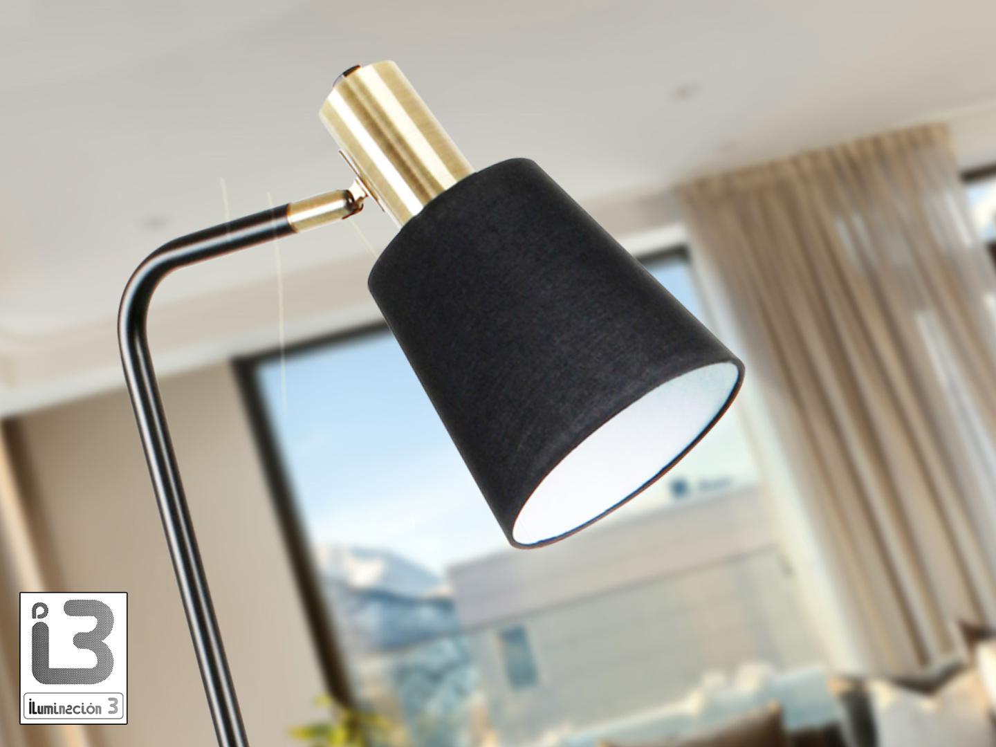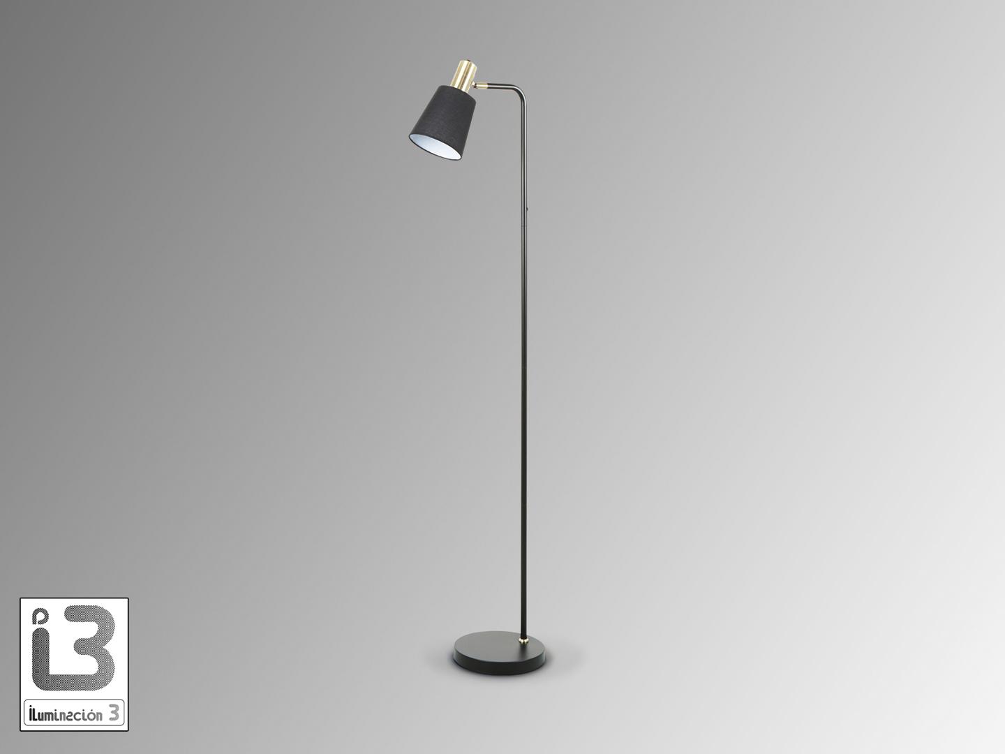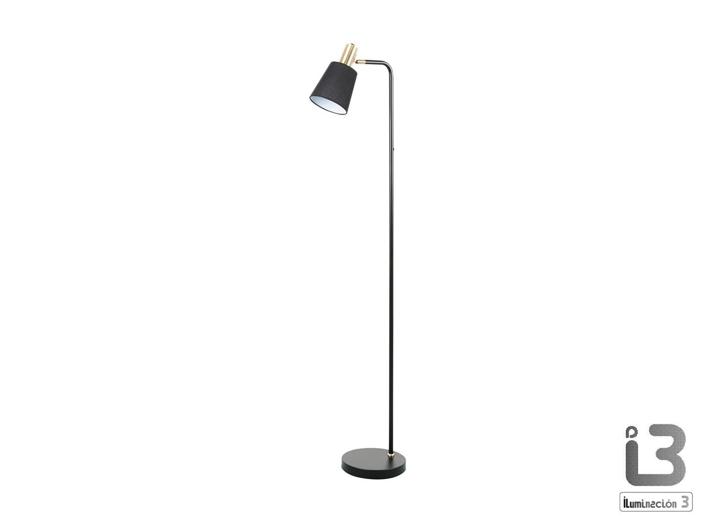 Напольный светильник из металла, отделанный в матово-черный цвет, с деталями из сатинированной латуни. Черный текстильный абажур с регулируемым наклоном. 1 E27