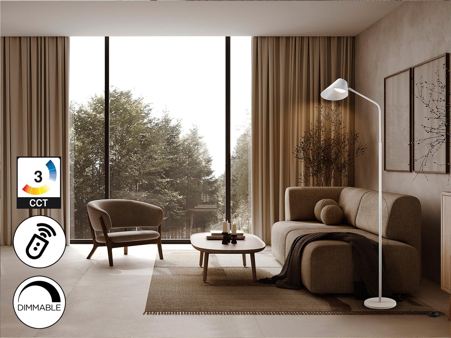 Напольный светильник из металла и алюминия, матово-белый цвет, опаловый рассеиватель. Тактильная кнопка и ПУЛЬТ ДИСТАНЦИОННОГО УПРАВЛЕНИЯ. Регулируемый прожектор, регулировка яркости света, регулируемая цветовая температура. Светодиод 10 Вт, 900 лм, CCT 3000K-6500K.