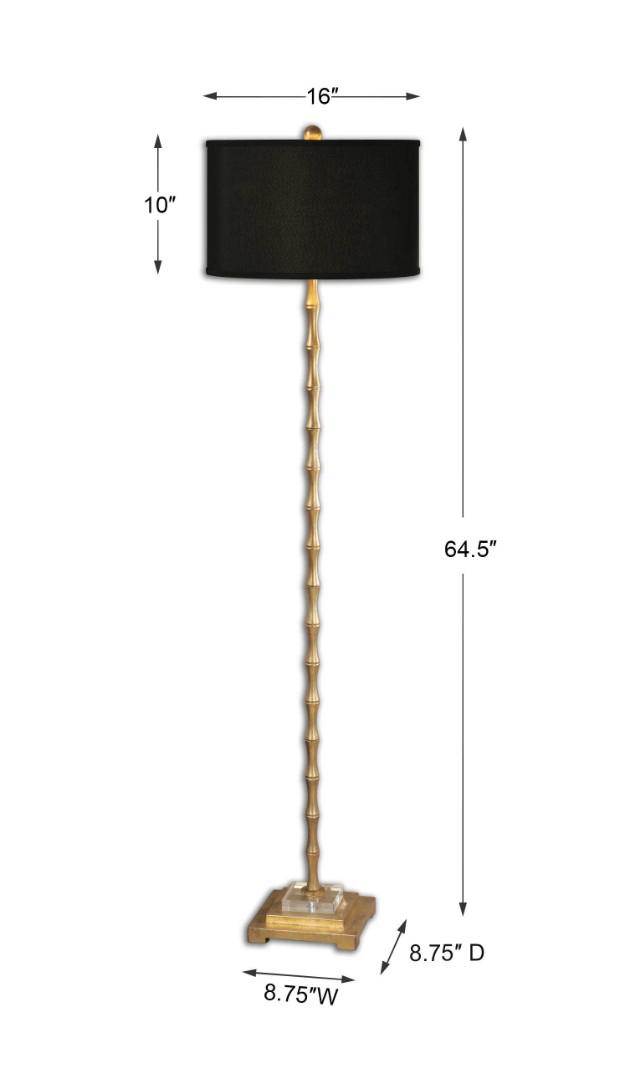 Стильный торшер, что несомненно придется по вкусу многим. Основа торшера изготовлена из металла в форме бамбука с отделкой из сусального золота и дополнена хрустальными деталями. Абажур изготовлен из льняной ткани черного цвета. Сочетание золотого и черного всегда смотрится стильно, и этот случай не стал исключением. Подобный торшер несомненно сумеет не только вписаться в интерьер, но и украсить его собой.