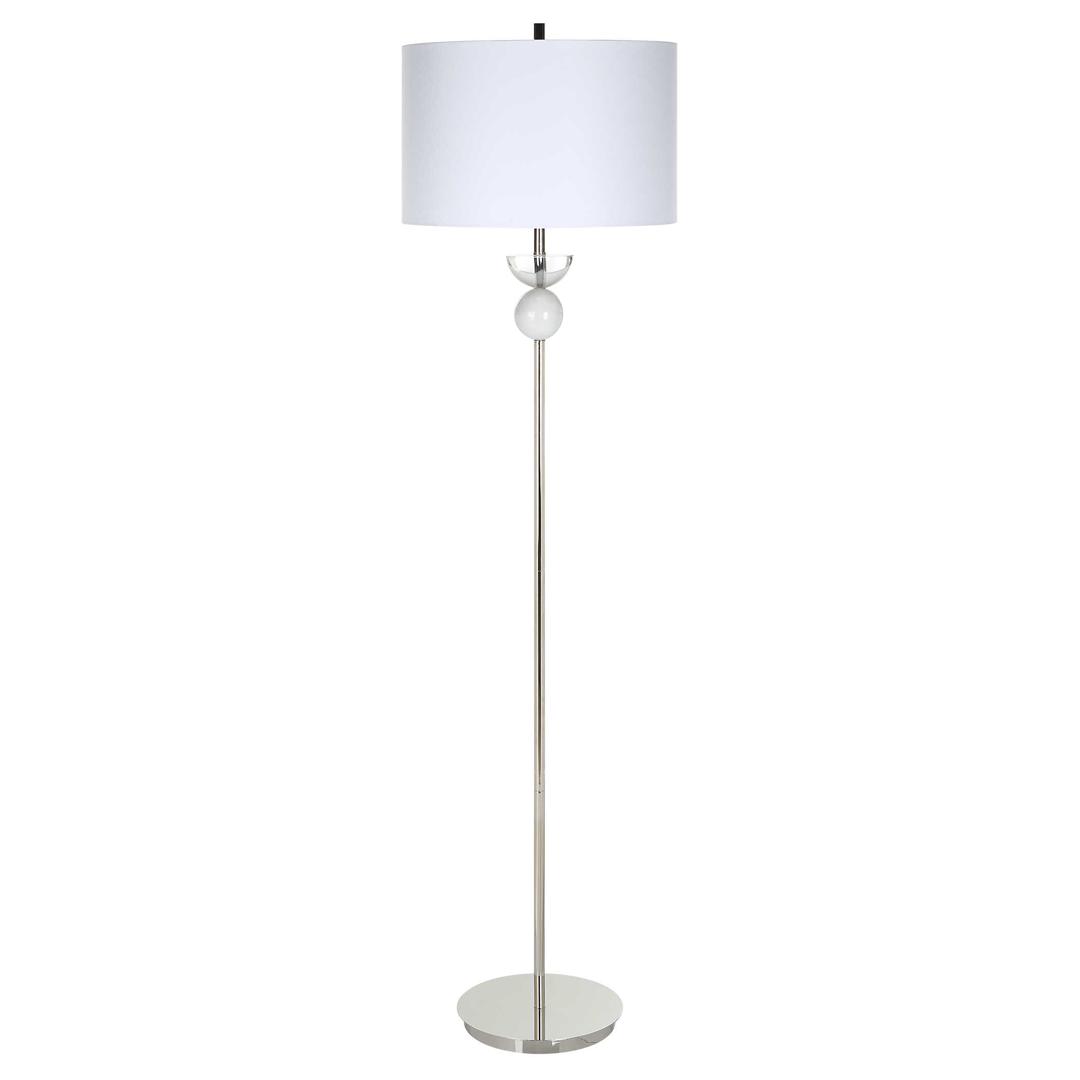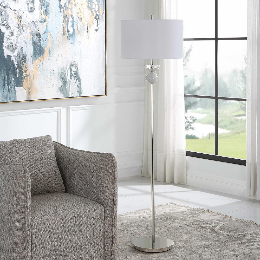 Изысканный торшер, выполненный в современном стиле. Железное основание из полированного никеля дополнено деталями из натурального мрамора и хрусталя. Абажур торшера выполнен из льняной ткани. Такой торшер несомненно сумеет вписаться практически в любой интерьер.