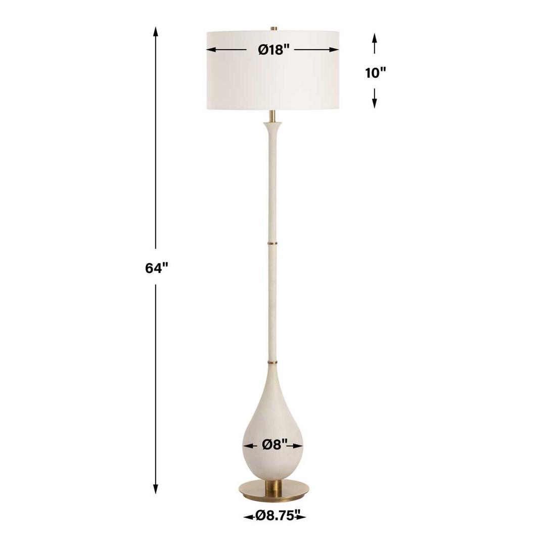 Этот торшер с основанием в форме капли из искусственного камня цвета слоновой кости, точно воспроизводящим текстуру тасосского мрамора, и декорированным деталями из матовой состаренной латуни, станет изысканным дополнением любого интерьера. Круглый абажур обтянут белоснежной льняной тканью.