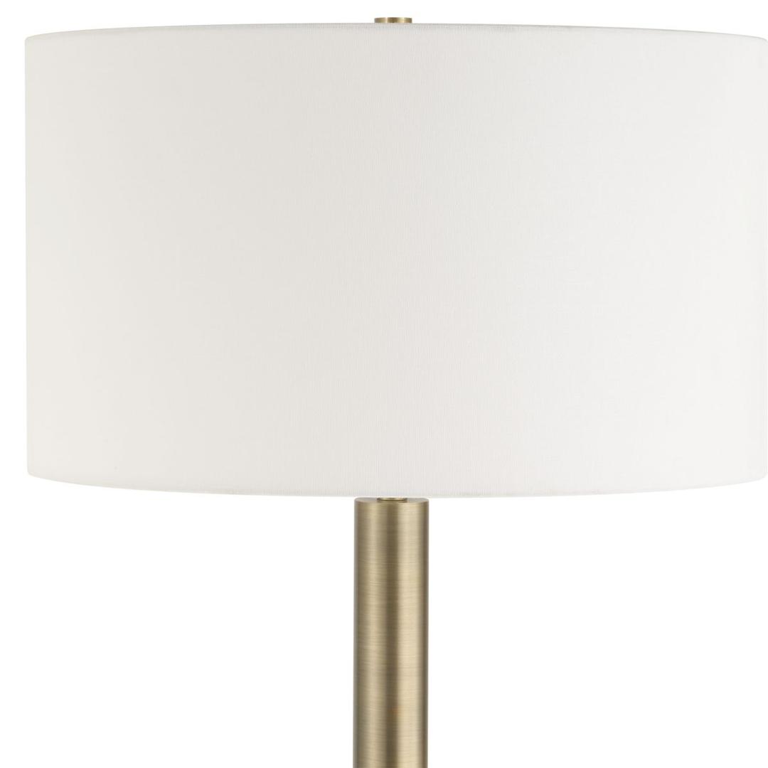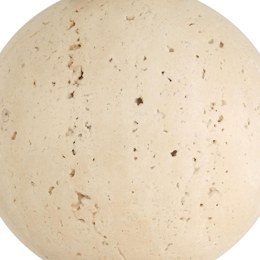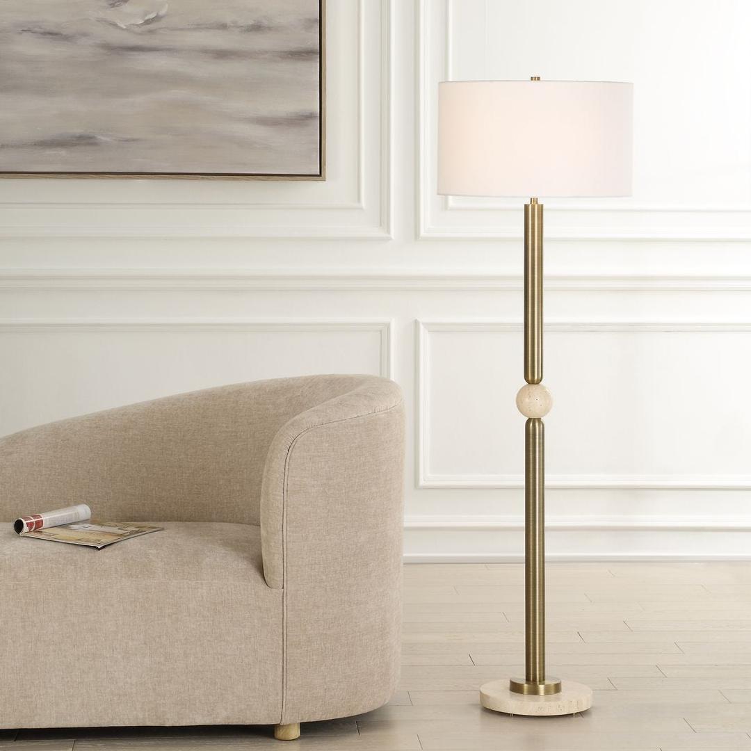 Прекрасный торшер, способный прийтись по вкусу многим. Торшер имеет элегантное основание из позолоченной стали, дополненное шаром из цельного травертина и такой же ножкой. Круглый абажур в форме барабана обтянут белоснежной льняной тканью.