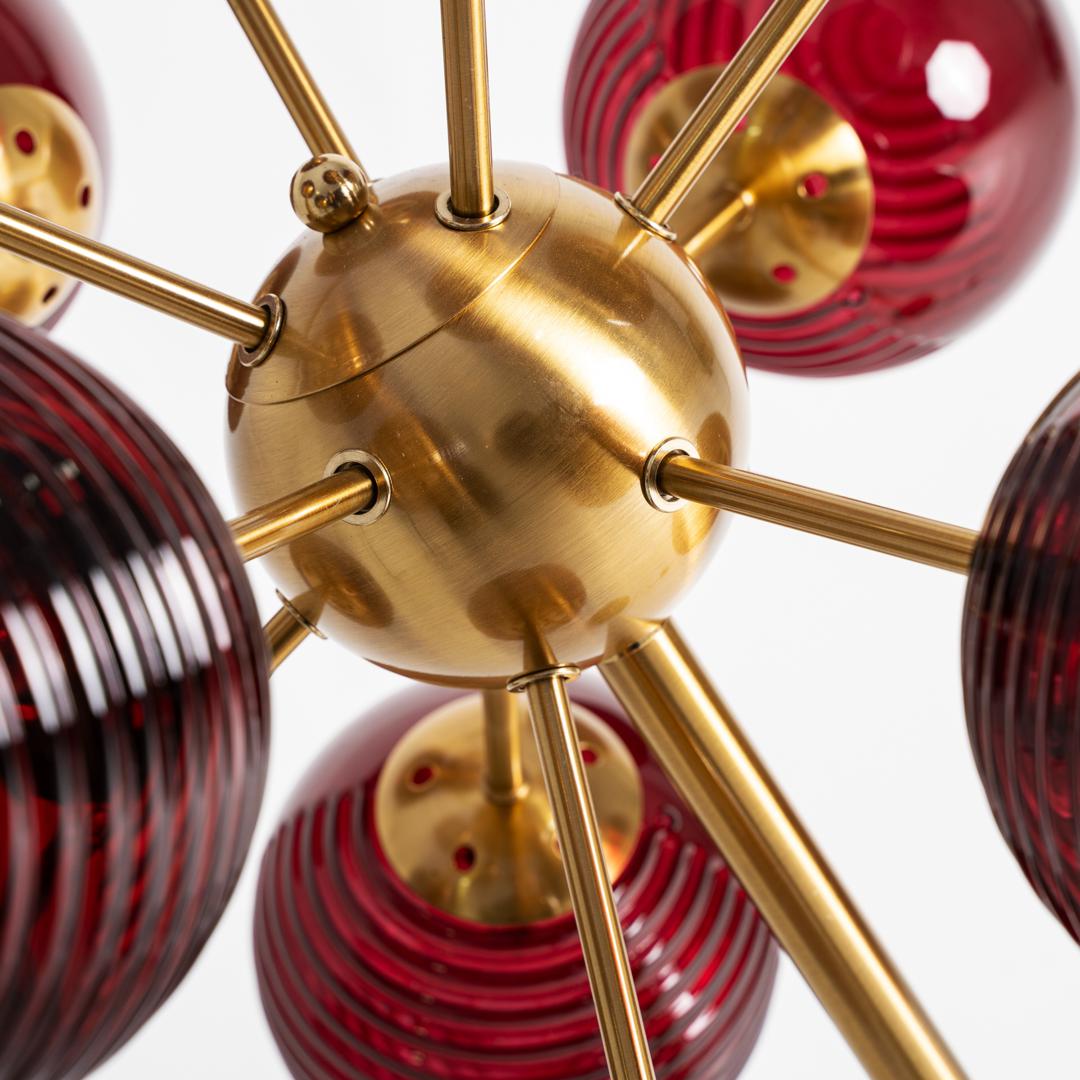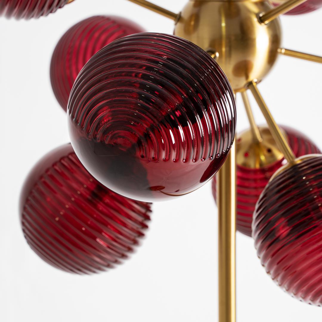 Напольный светильник Alaia в стиле ар-деко, выполнен из бордового стекла в сочетании с золотистым железом. Изделие разборное. Ширина: 66 см, Глубина: 66 см, Высота: 168 см