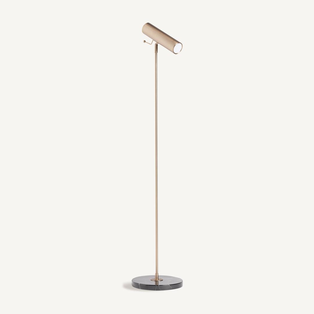 Напольный светильник в стиле ар-деко, изготовленный из железа золотистого цвета в сочетании с черным мрамором. Ширина: 25 см, Глубина: 25 см, Высота: 129 см