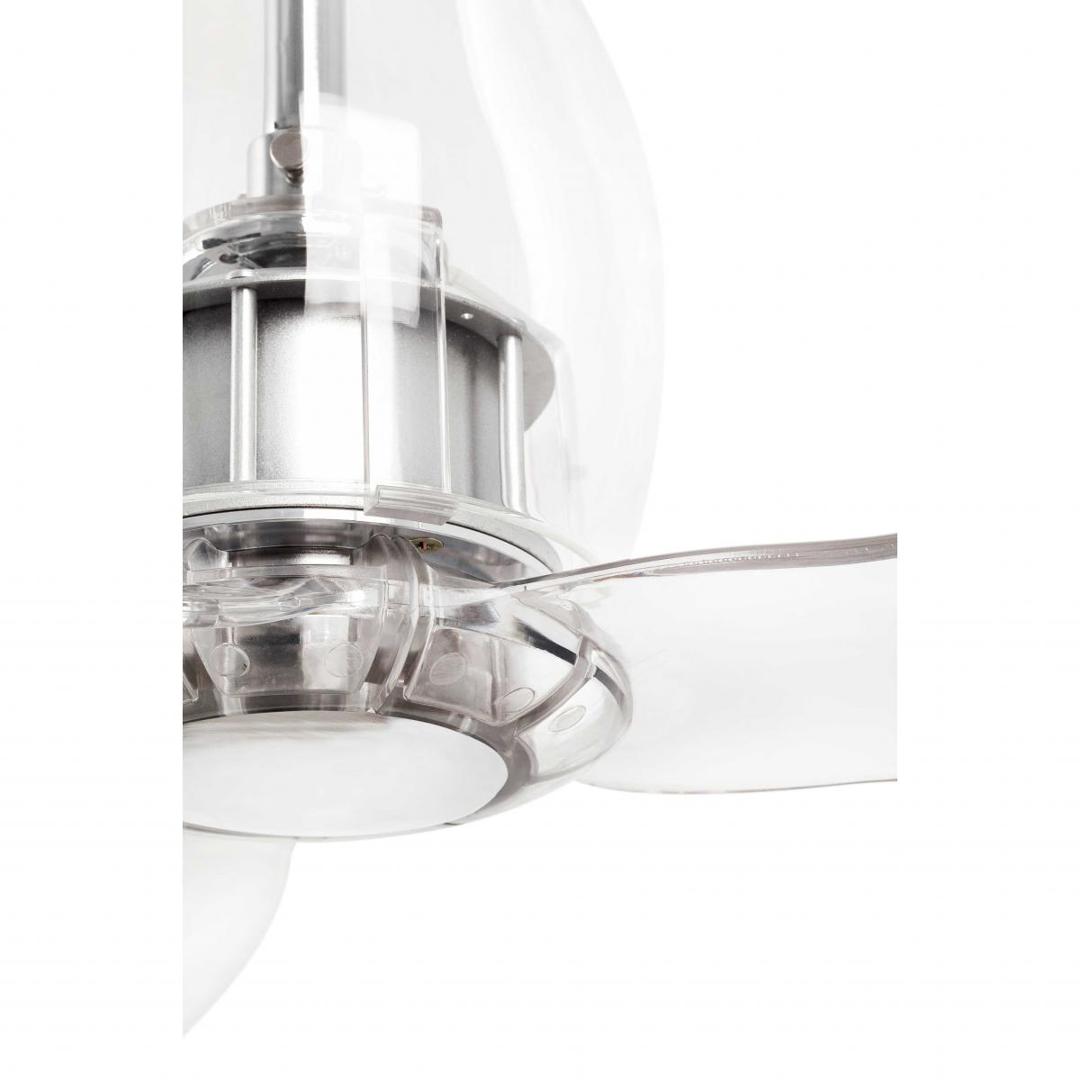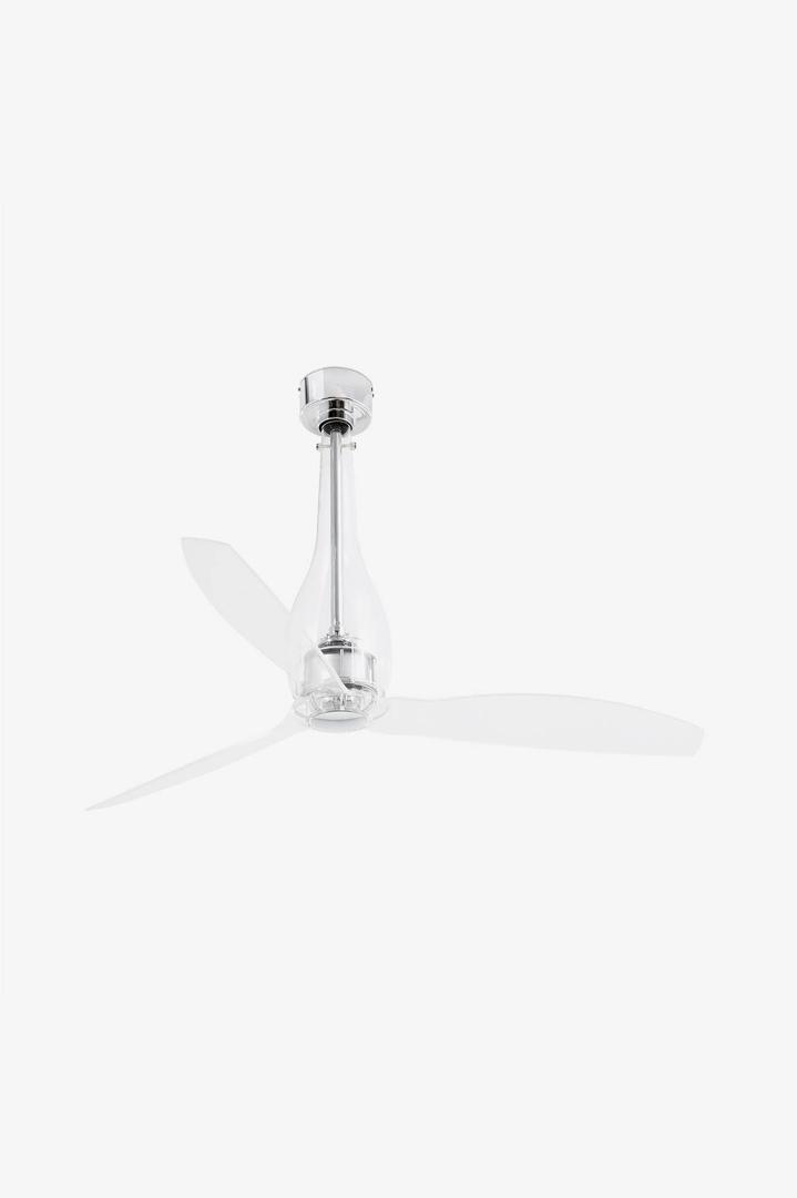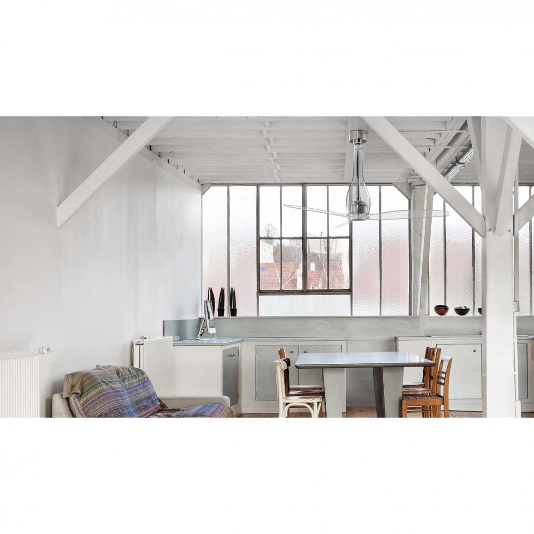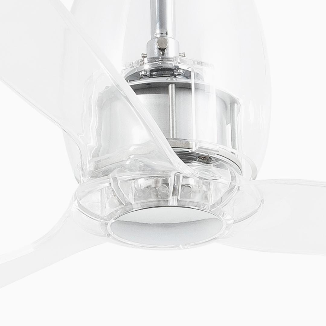 Потолочный вентилятор с двигателем постоянного тока современных линий собственного дизайна. Для комнат от 17,6м2. Мотор из металла и прозрачного стекла с прозрачными лопастями для ПК. Действие с пульта дистанционного управления, в комплекте. Он имеет 6 регулируемых скоростей с потреблением 3,5-5,8-8,8-13,4-21,5-32,4 Вт и 51-77-103-129-155-185 оборотов в минуту в зависимости от скорости. Этот вентилятор имеет функцию реверса. Расход воздуха: 145,66 м3 / мин / 5144 куб.