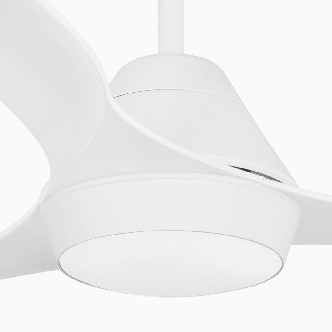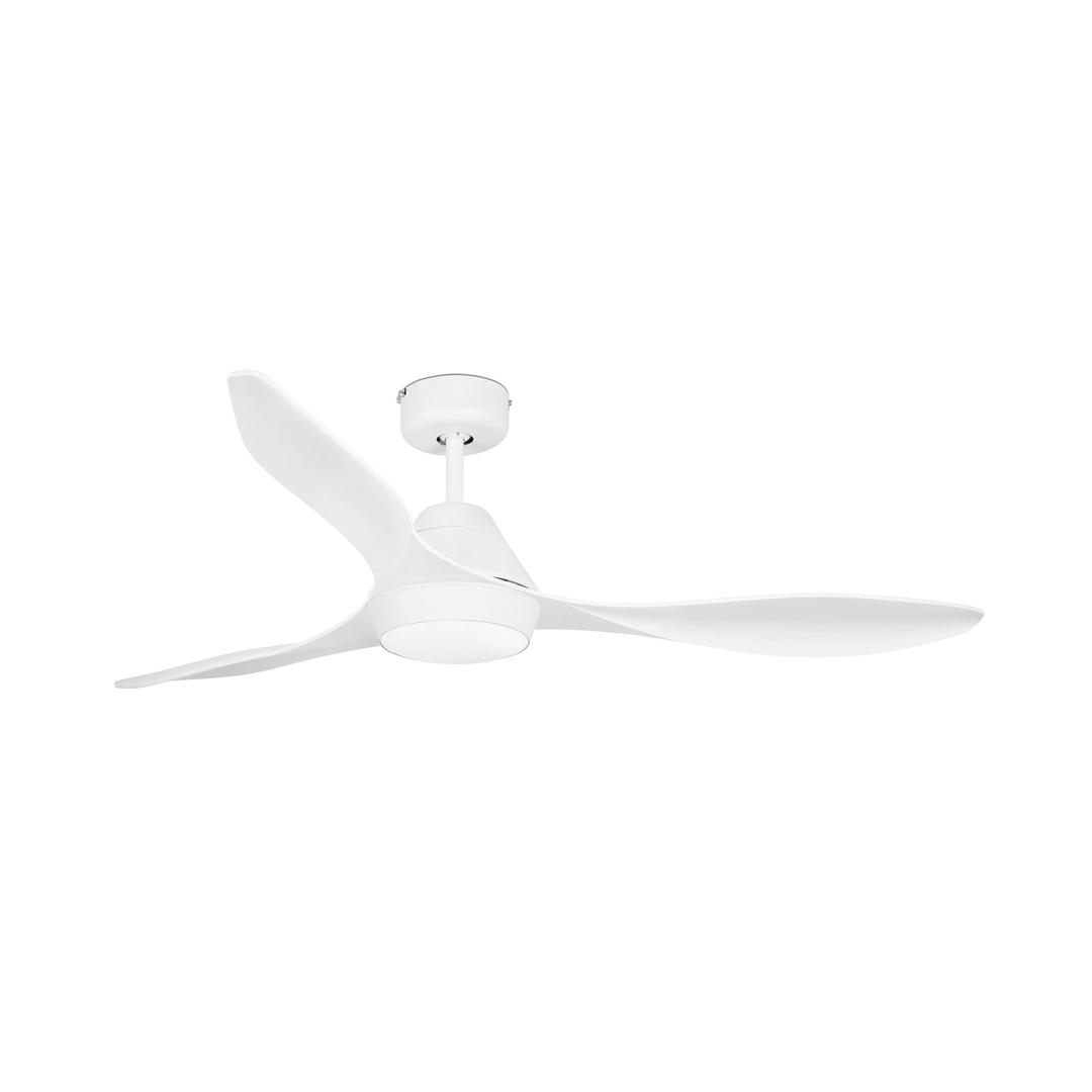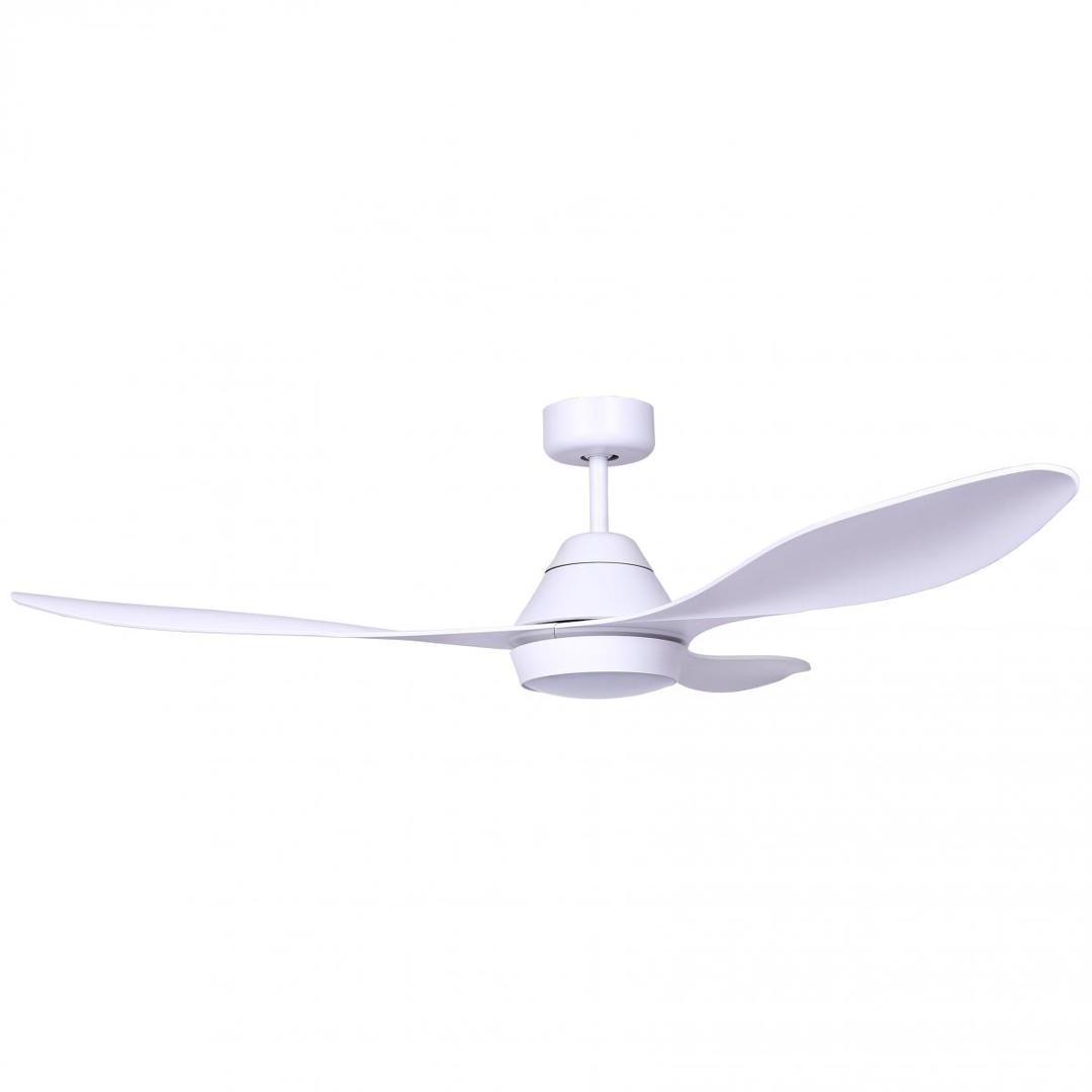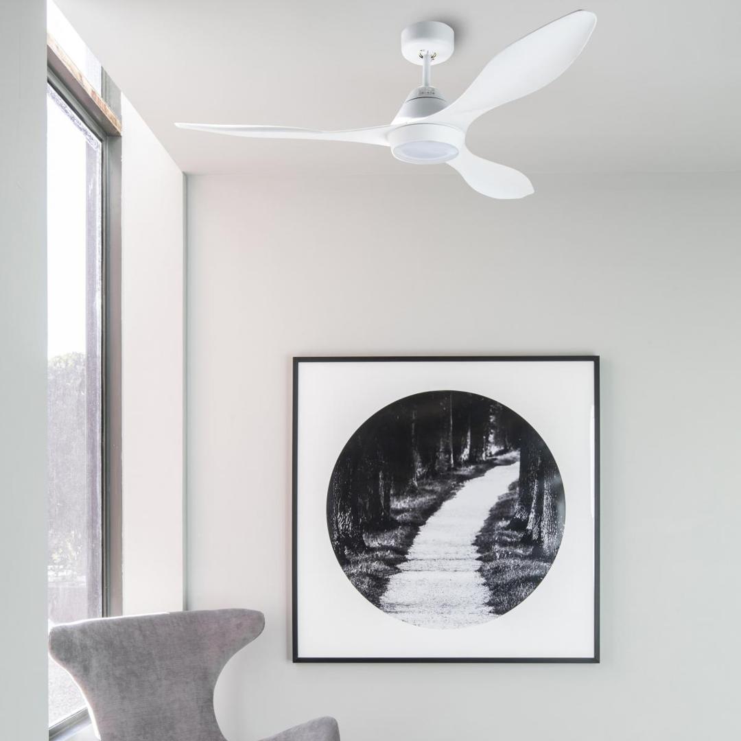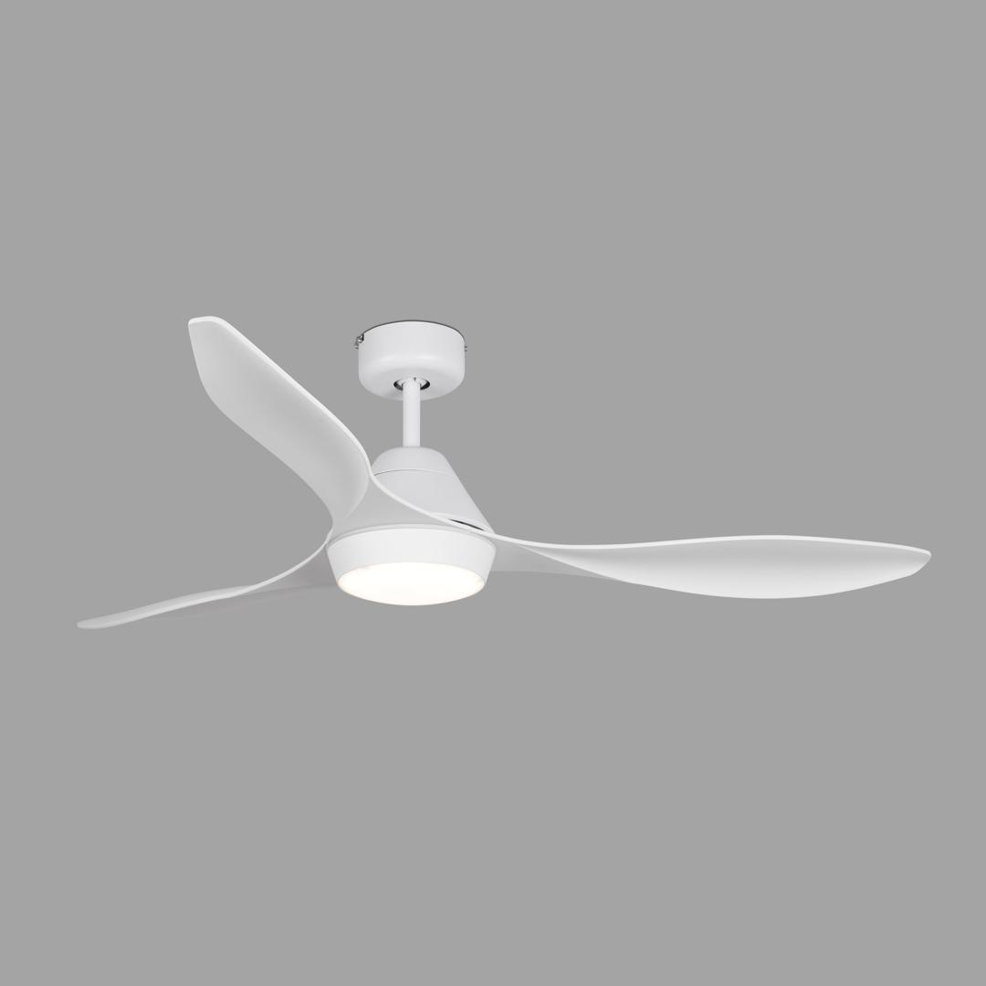 Белый потолочный вентилятор с современными линиями двигателя постоянного тока и подсветкой. Для комнат 17,6м2. Действие с пульта дистанционного управления, в комплекте. Он имеет 5 регулируемых скоростей с расходом 4-9-16-23-35 и 86-108-130-145-175 оборотов в минуту в зависимости от скорости. Этот вентилятор имеет функцию реверса и подходит для наклонного потолка. Расход воздуха: 164,32 м3, мин / 5803 куб.